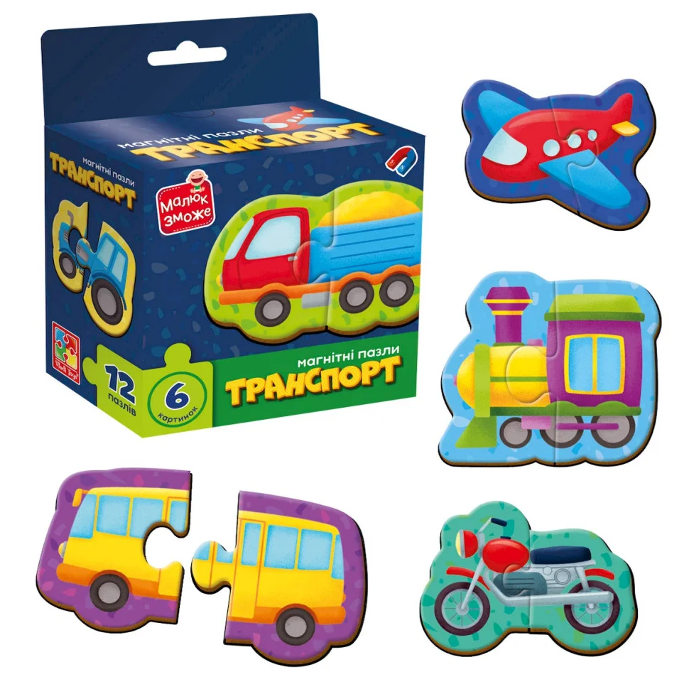 Дитячі магнітні пазли "Транспорт" Vladi Toys VT1733-02 - це захоплююча гра для малюків, яка познайомить їх зі світом різних видів транспорту. У набір входить 12 магнітних елементів із зображеннями машин, літаків, поїздів та інших засобів пересування, які легко кріпляться на холодильник, магнітну дошку або спеціальний планшет.