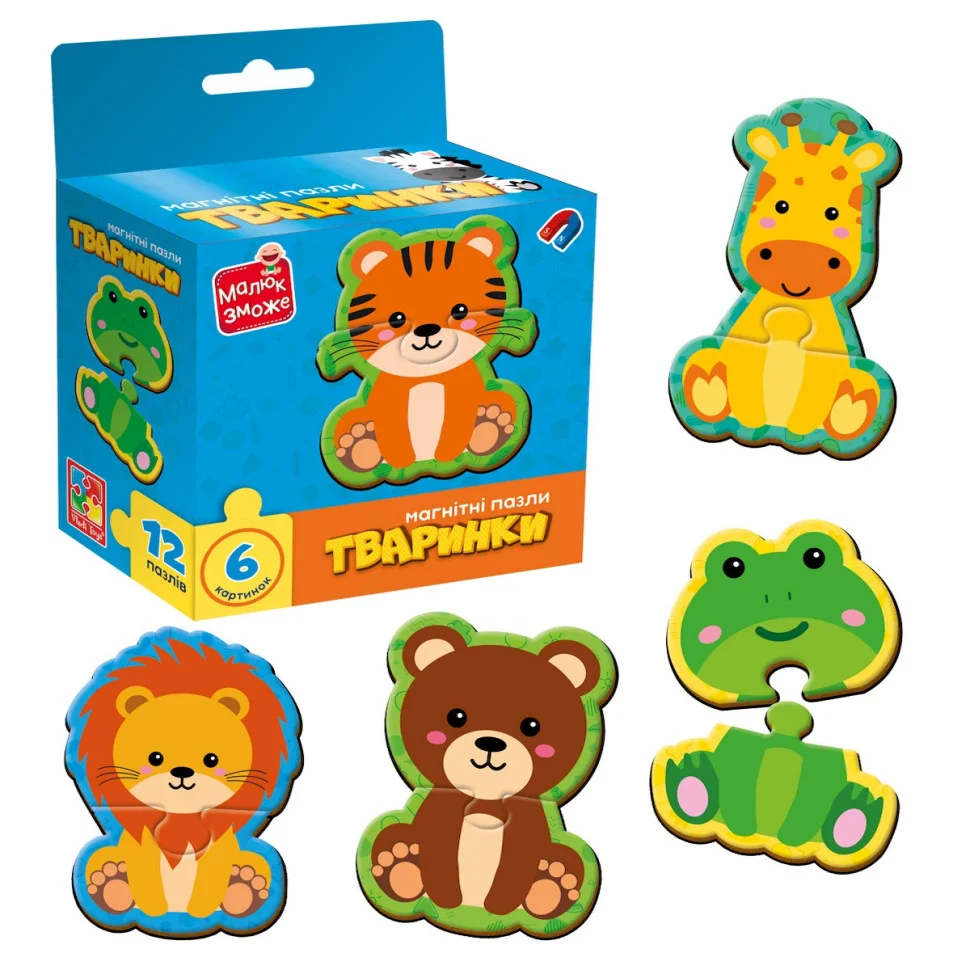 Розвиваюча гра Vladi Toys магнітні пазли "Тваринки" VT1733-04 - чудовий набір для малюків, який допомагає весело й корисно вивчати світ тварин. У комплекті 12 магнітних елементів із яскравими зображеннями звірят, що легко кріпляться на магнітну дошку, холодильник або спеціальний планшет.