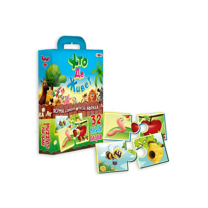 Не тільки розвага, а й навчання - міні-пазли «Хто де живе» (Strateg 30700) познайомлять малюка з мешканцями ферми і ліси, тваринами Африки і комахами. Крім цього покажуть місця, де вони мешкають. Всього в наборі 36 міні-пазлів, що складаються з двох частин - необхідно підібрати кожній тварині його житло. Щоб допомогти малюкові в комплекті є картки з готовими картинками. Процес складання малюнка з окремих фрагментів зображення допоможе розвинути не тільки логіку, уяву, пам'ять, але і фізичні навички - такі як координацію і моторику пальчиків. Ігри з пазлами сприяють розвитку особистості та характеру малюка - посидючості, акуратності та наполегливості. Високоякісна зносостійка поліграфія збереже зображення навіть після багаторазового збирання. Кількість елементів кожного пазла - 2, розмір картинок - 12 х 7 см, упаковані елементи в красиву коробку з ручкою. Мова українська. Вік: 3 + Матеріал: тришаровий картон; Комплект: 36 міні-пазлів; Розмір в зібраному вигляді: 12 х 7 см; Розмір упаковки: 23 х 18 x 5 см.