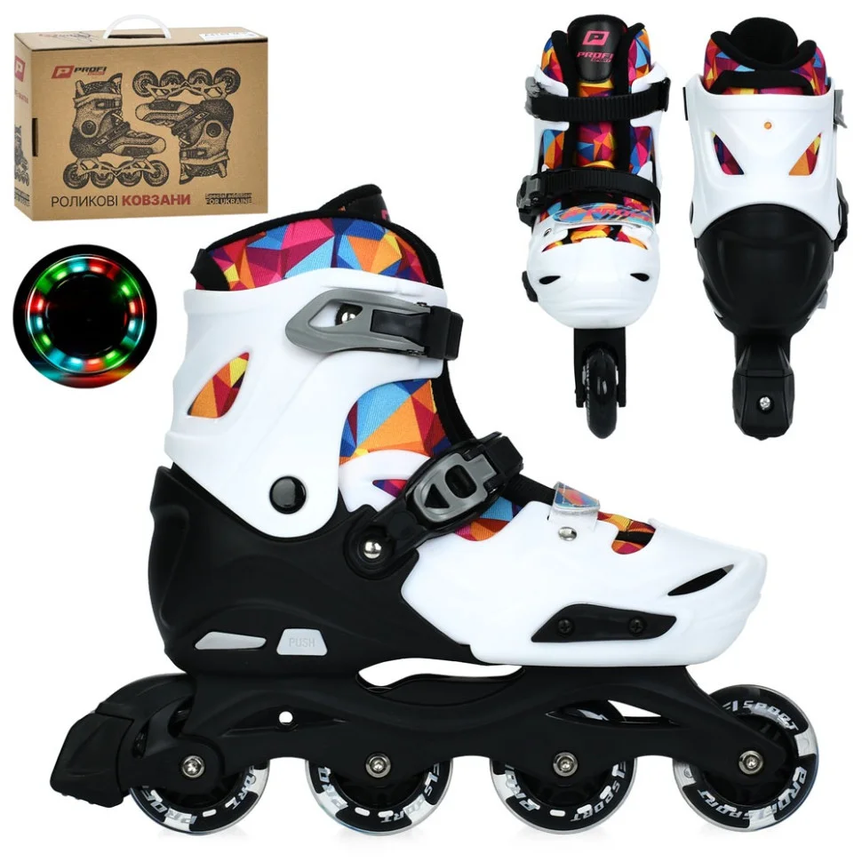 Особливу увагу привертає внутрішній чобіт із барвистим принтом у формі різнобарвних клітин — він додає характеру та робить ролики помітними на вулиці. А світні колеса не тільки мають ефектний вигляд у русі, але й покращують видимість у сутінку.