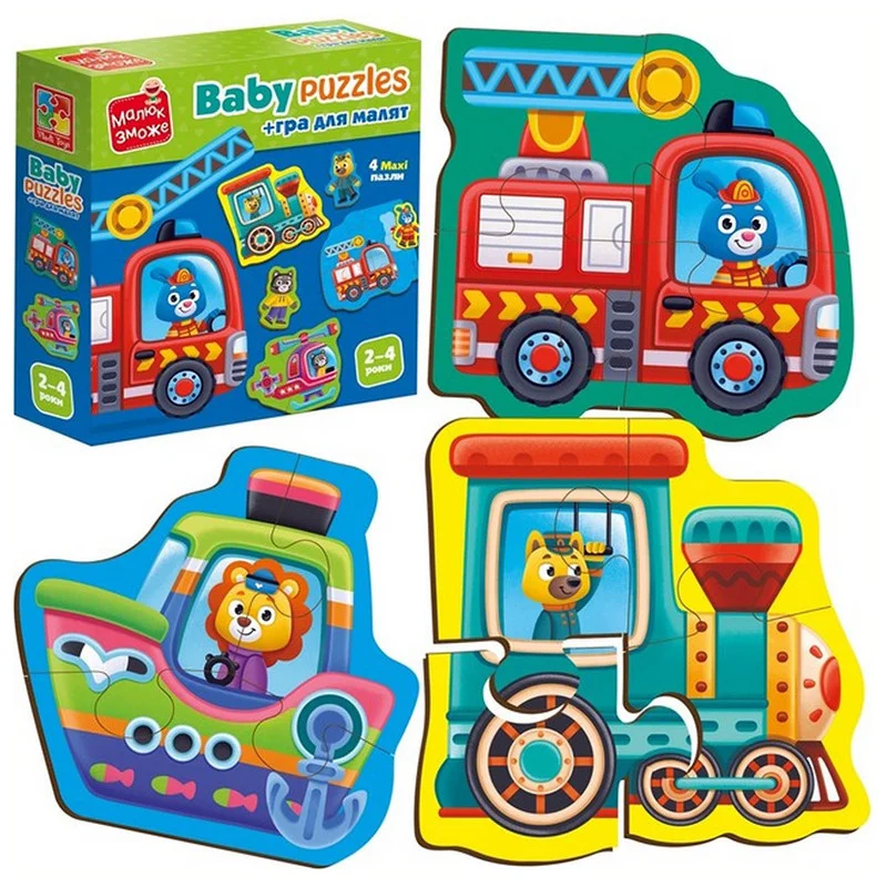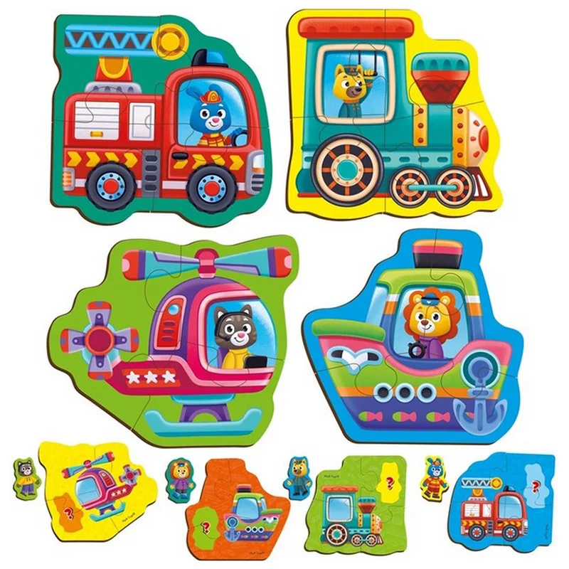 Складайте пазли з казковими звірятами в транспорті! Дуже яскраві та різнокольорові картинки точно сподобаються вашій дитині. Усі деталі великі, завдяки цьому їх дуже зручно тримати дитячими ручками. Вони надійно скріплюються між собою! У процесі гри з пазлами малюк тренує уяву, пам'ять, просторове сприйняття та дрібну моторику!
