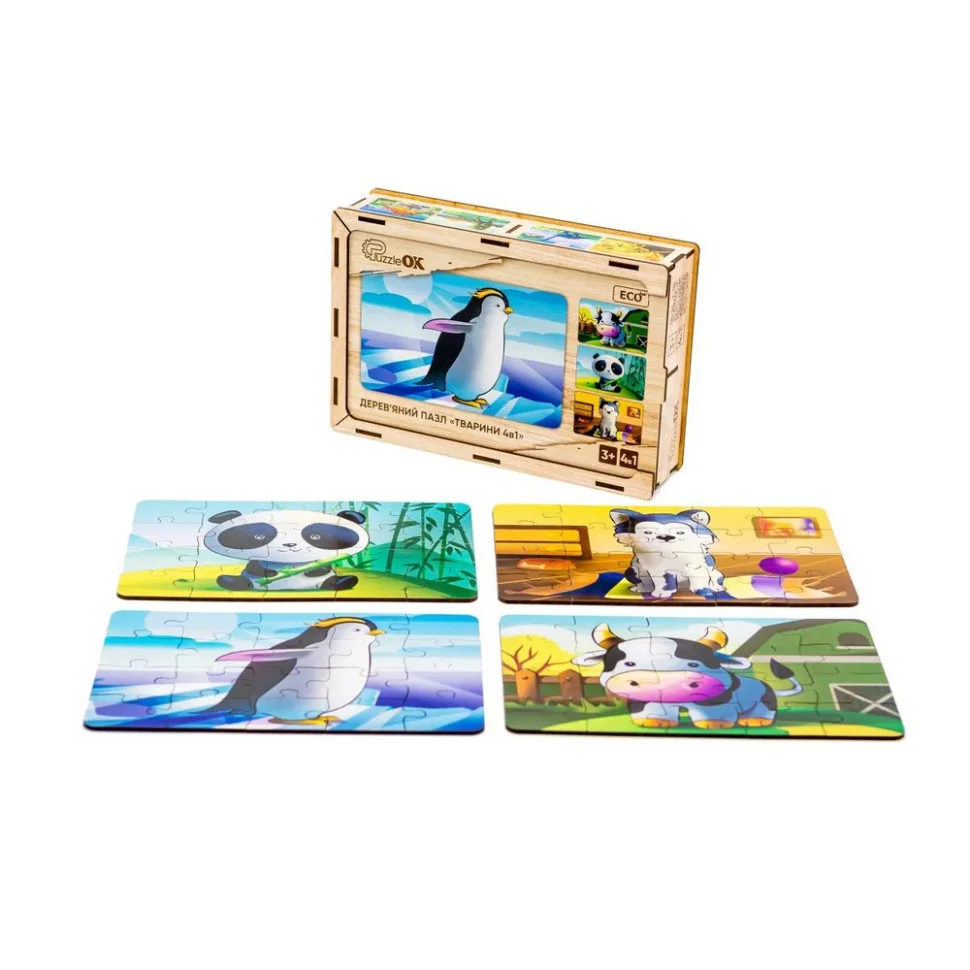 У комплекті знаходяться 4 пазли із зображеннями собачки, панди, пінгвіна та телятка. Кумедні малюнки сприятимуть гарному настрою вашої дитини, а складання деталей в картинку розвиватиме її увагу, дрібну моторику, посидючість.