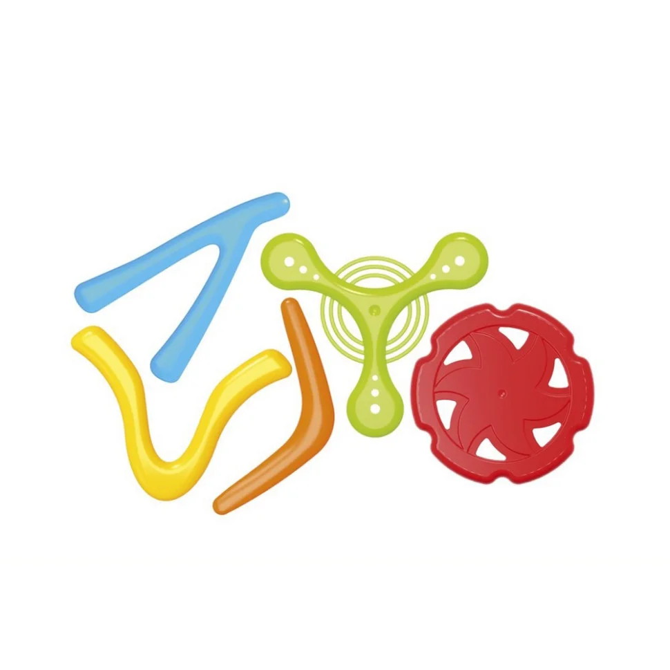 Комплект із п'яти літаючих фігур. Рекомендуємо для розваг усією сім'єю на природі. У комплекті два літаючі диски та три бумеранги. Літаючі диски з поліпшеними аеродинамічними властивостями можна застосовувати в класичних фрісбі-іграх: "Фрістайл", "Дог-фрісбі", "Диск-гольф", а бумеранги дадуть можливість відчути себе справжнім мисливцем.