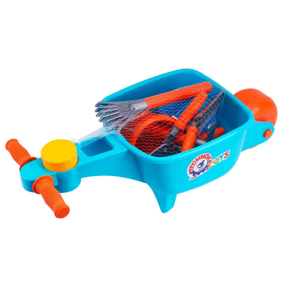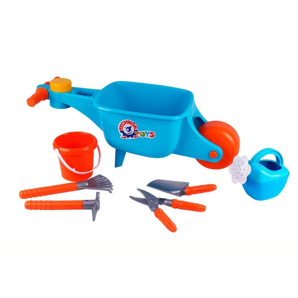 У наборі: тачка, лійка, відерце, секатор, совок, граблі, сапка.
