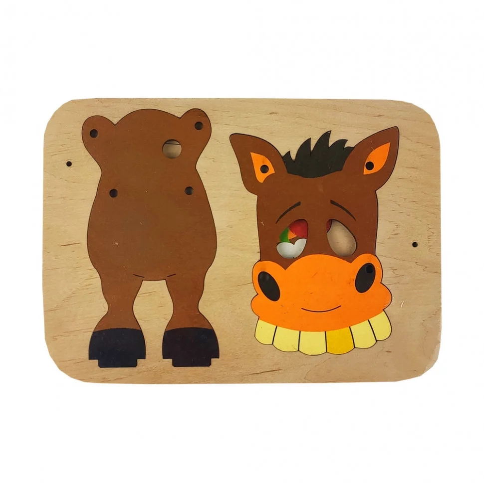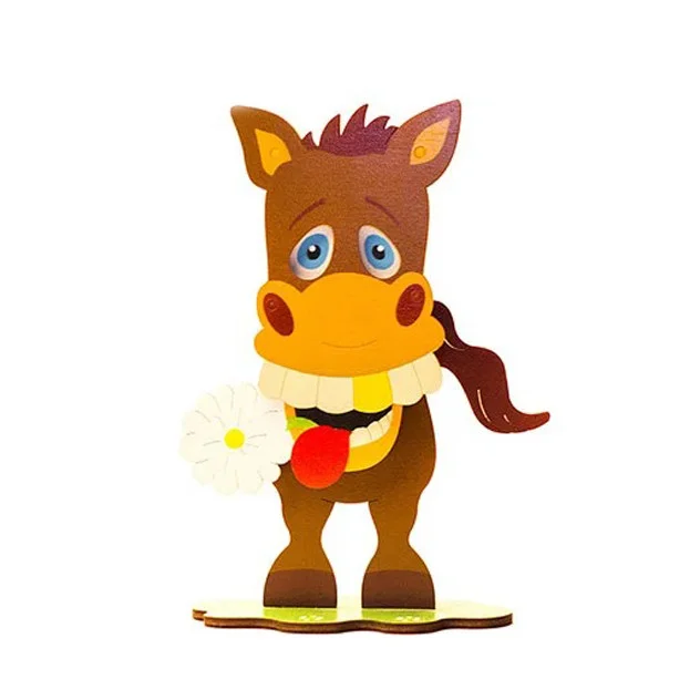 Іграшка-конструктор Конячка. Рухаючи за хвіст, рухається інша залежна частина тіла - створюючи ефект ніби конячка жує. Іграшка розвиває дрібну моторику, посидючість, логіку. Дозволить малюкові вивчити кольори і форми.