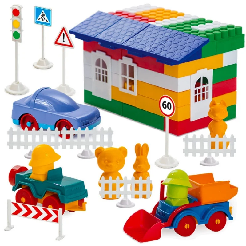 Конструктор "Лідер" No5 (200 дет.) - відмінний подарунок для допитливої, активної дитини, яка тільки пізнає навколишній світ. Дуже великий конструктор, що складається з величезної кількості елементів: різнокольорових блоків, які легко з'єднуються між собою, машинок різного призначення - від легкової, до снігоприбиральної машини, маленьких парканчиків, знаків дорожнього руху і світлофора, а також вставних віконних блоків, дверей і частин даху. З таким набором "будівельного матеріалу" можна побудувати ціле містечко!