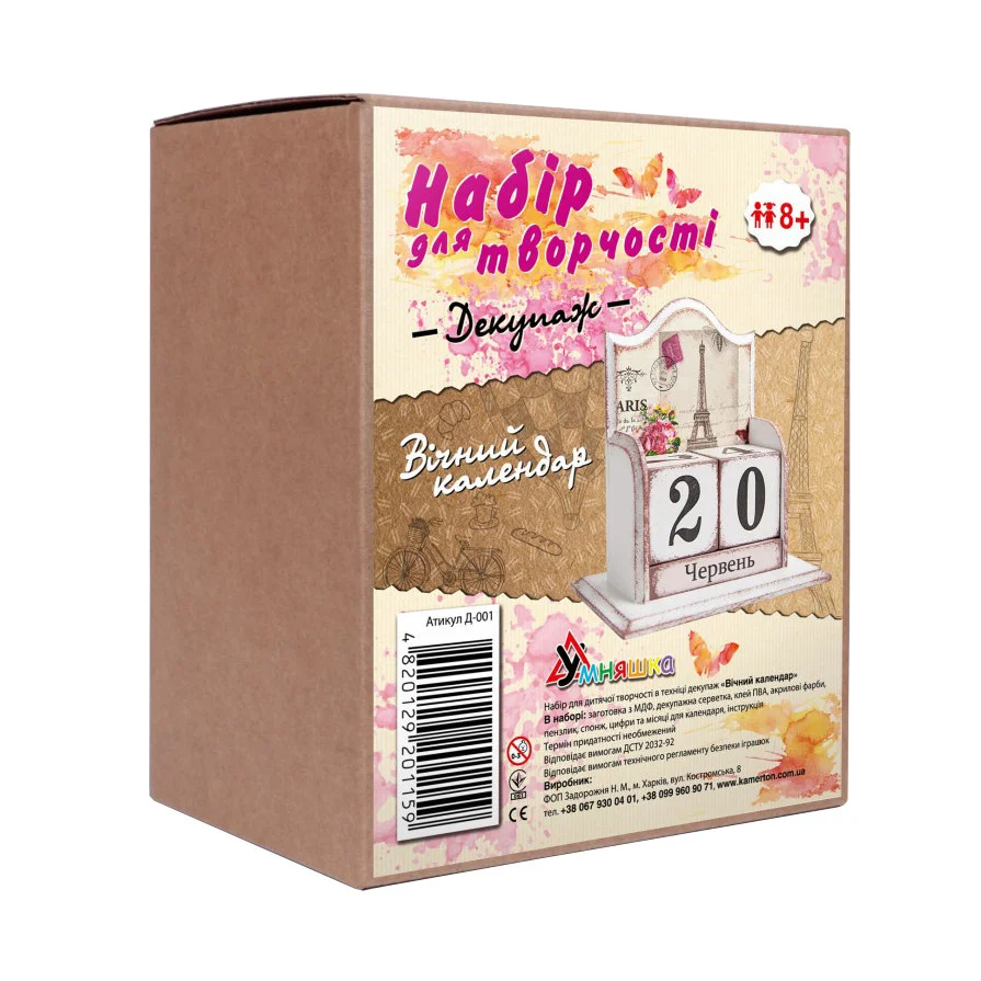 Цікавий набір для творчості. Декупаж "Вічний календар" (Д-001) D-001 орієнтований на дітей від восьми років, зацікавить малюків, який люблять майструвати своїми руками і самостійно створювати красиві речі. Готовий виріб Вічний календар Ваша дитина буде з радістю демонструвати навколишні, використовувати їх для декорування дитячої кімнати. Захоплююче заняття вимагає уважності і концентрації, що посприяє формуванню у Вашій доні посидючості, терпіння, самостійності і цілеспрямованості. Всі комплектуючі розроблені з безпечного, екологічно чистого і нетоксичного сировини, яке практично не має запахів і абсолютно нешкідливо для діток. Творчий захоплюючий процес позитивно впливає на психоемоційний стан малятка, сприяє формуванню посидючості, терплячості, вчить Вашу непосиду доводити розпочаті справи до кінця.