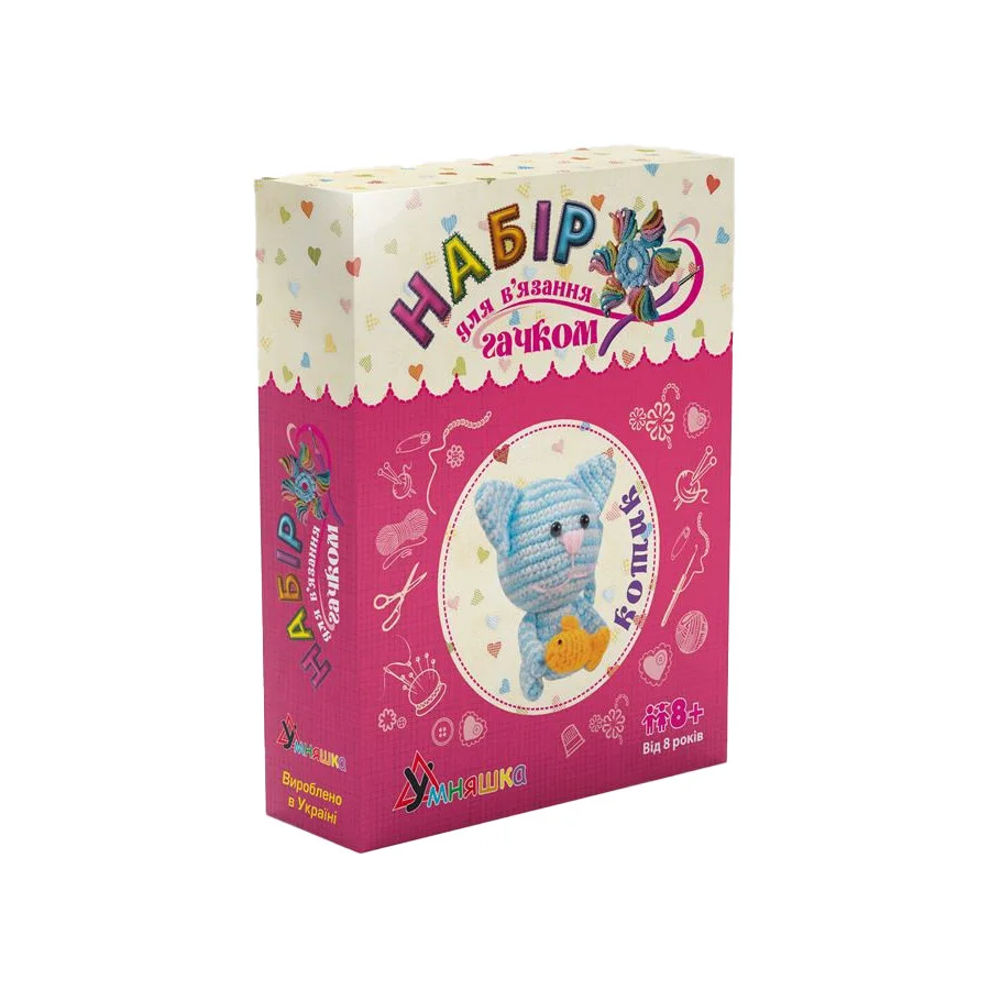 Призначений для юних рукодільниць від восьми років, універсальний набір для творчості. В'язання гачком "Котик" (ВК-005) BK-005 містить кольорову пряжу 100% дитячий гіпоалергенний акрил, гачок, оченята-намистинки в подарунковій упаковці 17 х 5 х 22 см. За допомогою цього чудового набору Ваша непосида навчитися в'язати гачком без допомоги дорослих . У комплекті передбачена пряжа, яка не зашкодить дитині і не спровокує появи неприємних алергічних реакцій. Захоплююча гра допоможе дитині самостійно зв'язати цікаву саморобку - чарівну кішечку. В'язання розвиває дрібну моторику, фантазію, логіку. Під час роботи пальчиками у дитини активізується мова і мислення, формується почуття самостійності. У поліпшеній колекції торгової марки представлено безліч цікавих творчих наборів, з якими Ваша крихітка навчитися новим навичкам, буде розвивати креативність, уважність і посидючість.