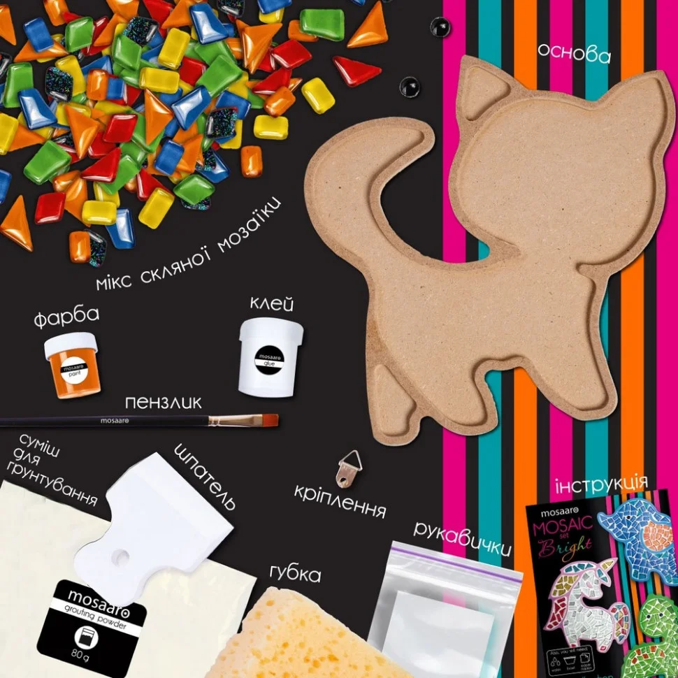 Комплектація: основа з МДФ, скляна мозаїка, акрилова фарба, суміш для затирання швів, пензлик, рукавички, набір кріплень, клей на водній основі, гумовий шпатель, губка, дерев'яна паличка, мірна ложка, папір пакувальний, мішечок зі спанбонду.