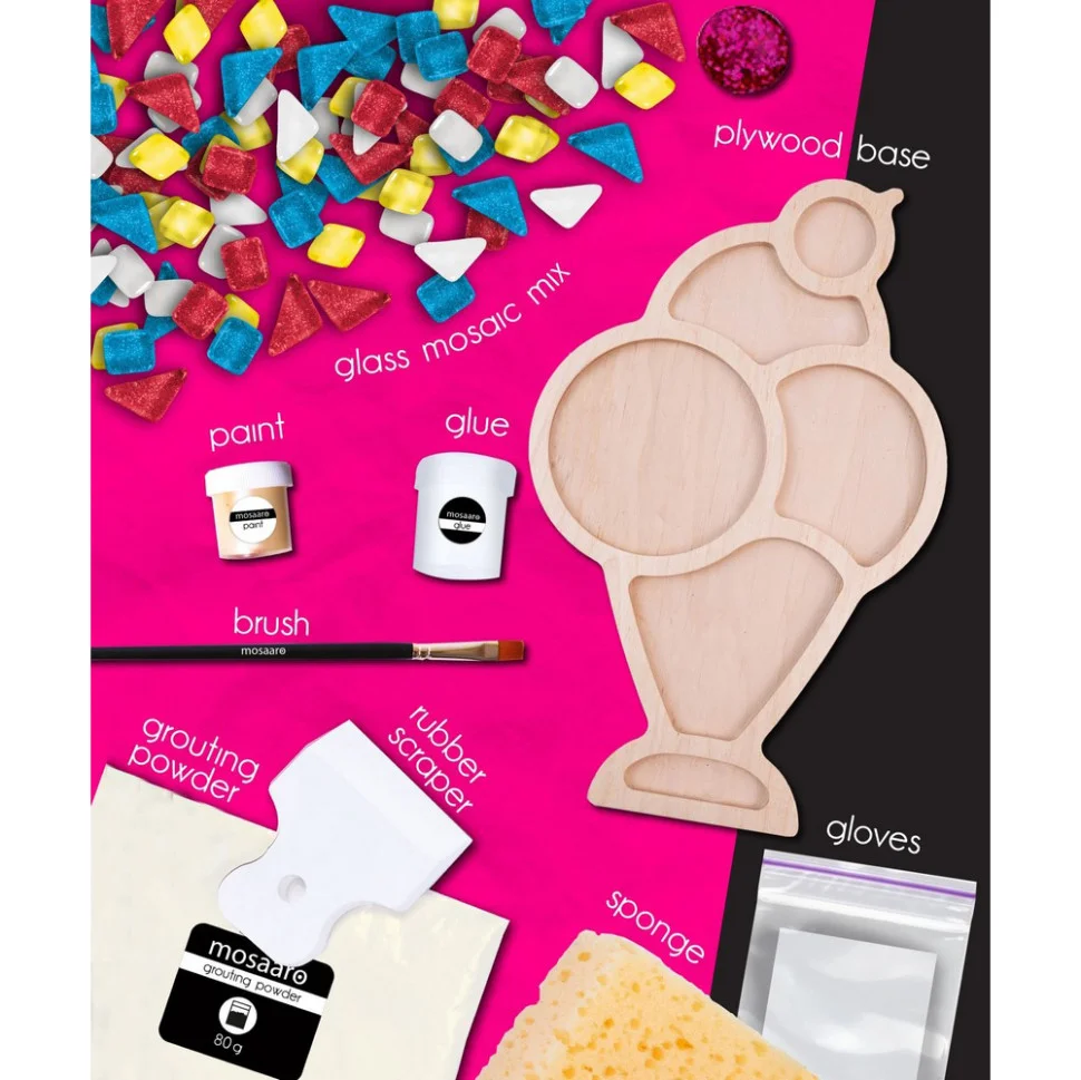Набір містить: основу з МДФ, набір скляної мозаїки, клей на водній основі, акрилову фарбу, пензлик, шпатель, суміш для затирання швів, дерев’яну паличку для замішування, рукавички, губку, кріплення на стіну, мірну ложку, мішечок, попередження, інструкцію.