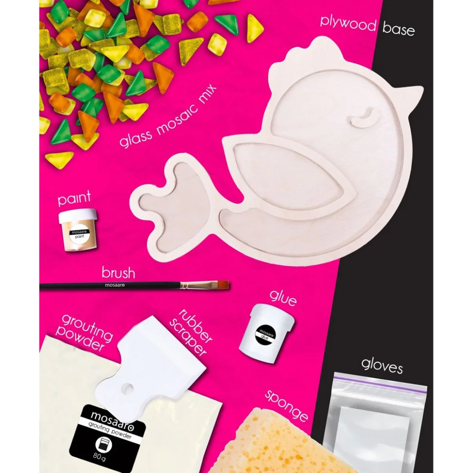Набір містить: основу з МДФ, набір скляної мозаїки, клей на водній основі, акрилову фарбу, пензлик, шпатель, суміш для затирання швів, дерев’яну паличку для замішування, рукавички, губку, кріплення на стіну, мірну ложку, мішечок, попередження, інструкцію.