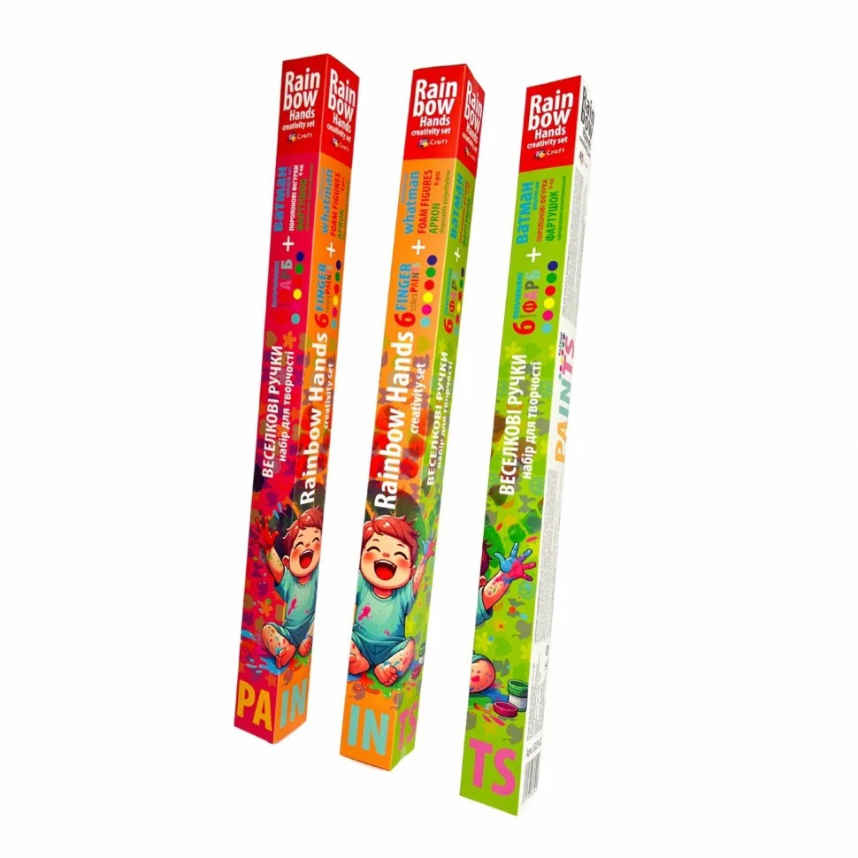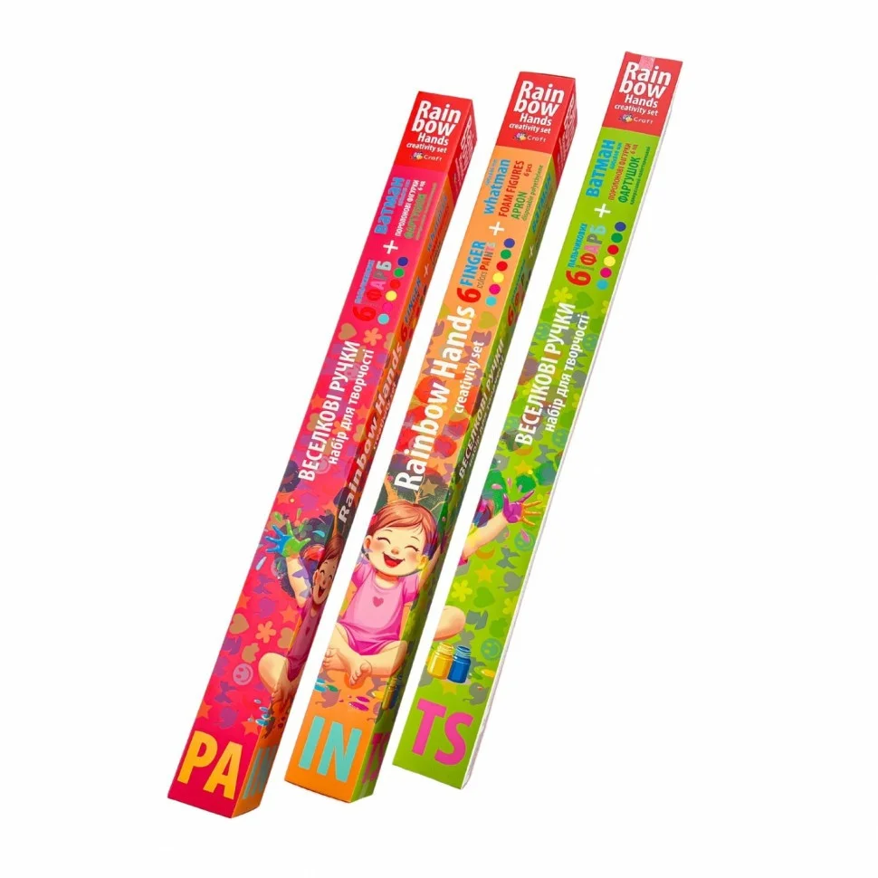 Набір для творчості "Веселкові ручки". До набору входить ватман 600х840 мм, набір пальчикових фарб 6 кольорів по 20 мл (синій, зелений, жовтий, червоний, рожевий, фіолетовий), одноразовий поліетиленовий фартушок, набір поролонових фігурок 6 шт. Малювання - одне з найулюбленіших занять дітей різного віку, а тому набір для творчості "Веселкові ручки" стане чудовим подарунком для дитини. Він допоможе діткам в навчанні координації рухів, а яскраві кольори сприятимуть розвитку кольоросприйняття та уяви. Набір поролонових фігурок з набору можна закріпити на кришечках від фарб, що дасть дитині можливість створювати різні відбитки на папері. Пальчикові фарби з набору підходять для малювання пензликами, спонжами або безпосередньо пальчиками. ПОПЕРЕДЖЕННЯ! Для дітей віком від 3-х років. Не допускати потрапляння до рота та очей складових набору. ОСОБАМ ВІКОМ ДО 14 РОКІВ ВИКОРИСТОВУВАТИ ПІД НАГЛЯДОМ БАТЬКІВ! Містить дрібні деталі. Після використання ретельно вимити руки теплою водою з милом. Особливості умов зберігання: зберігати в сухому місці при температурі від +5 до +30 С та відносній вологості не більше 75%. Фарби зберігати зі щільно закритими кришечками, якомога далі від сонячних променів для запобігання передчасного висихання. Продукція відповідає встановленим медичним критеріям безпеки. Використовувати за призначенням. Склад фарби: високоякісні дисперсії на водній основі та колоранти. Термін придатності 2 роки Зроблено в Україні