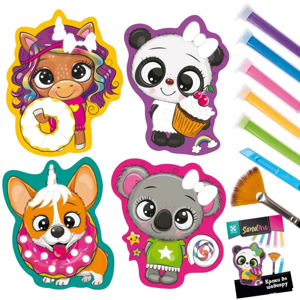 Комплектація: 5 флаконів з піском, 4 картинки, шпатель, пензлик, творчий посібник.