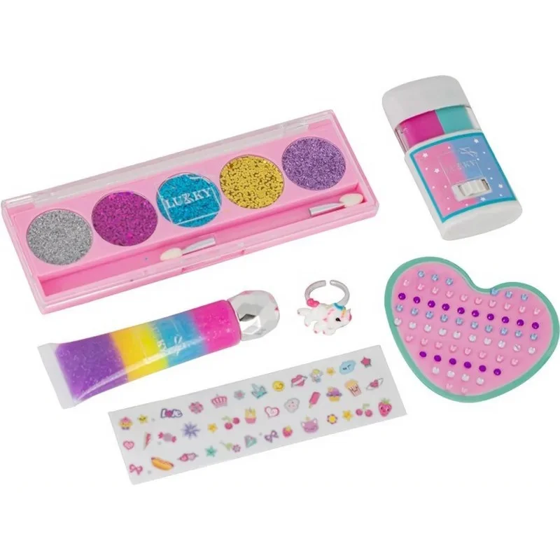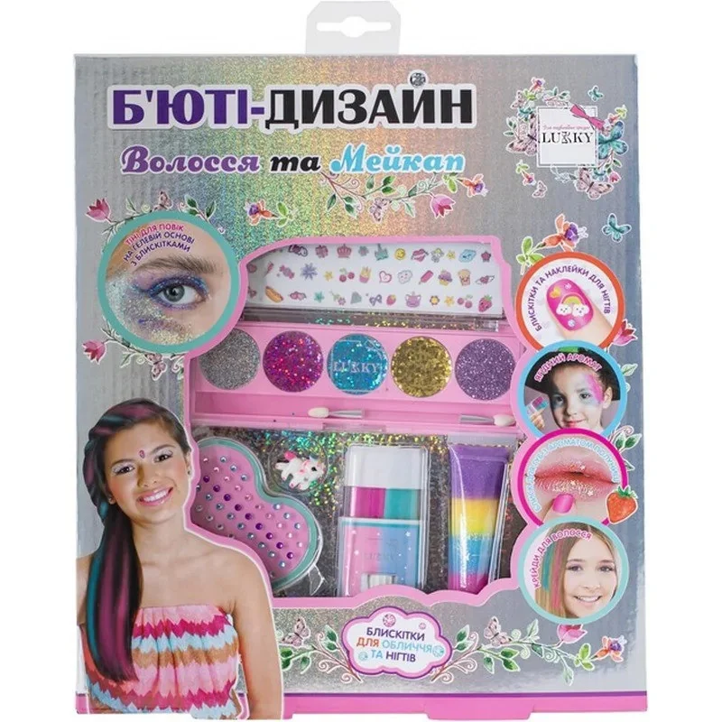 Набір косметики для дівчат "Волосся та мейкап" марки "Lukky". Набір складається: блиск для губ Гранатовий десерт - 1 шт гелеві тіні з блискітками та аплікатором, палетка 5 кольорів (фіолетовий, блакитний, золотистий, темно-червоний, сріблястий) - 1 шт крейда-пудра для волосся, колір рожевий "фуксія" - 1 шт крейда-пудра для волосся, колір бірюзовий - 1 шт блискітки для нігтів - 1 лист стікери для нігтів - 1 лист пластикове кільце "Єдиноріг" - 1 шт Кожна дівчинка легко зможе створити свій неповторний образ з косметикою Lukky легко та весело!