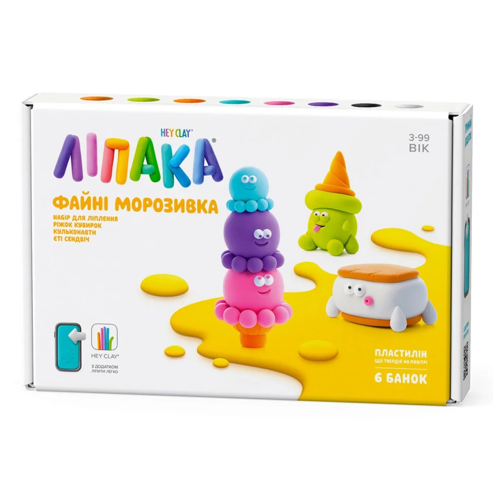 Набір самотвердіючого пластиліну ЛИПАКА – КЛАСНЕ МОРОЗИВО: ШАРИКОНАВТИ, ЙЕТІ СЕНДВІЧ, РОЖОК КУВИРОК – розважить і дітей, і дорослих. За допомогою анімаційних інструкцій у додатку HEY CLAY ви зможете зліпити 3 кумедних героїв. Пластилін твердне на повітрі за 24 години, після чого можна гратися створеними фігурками.