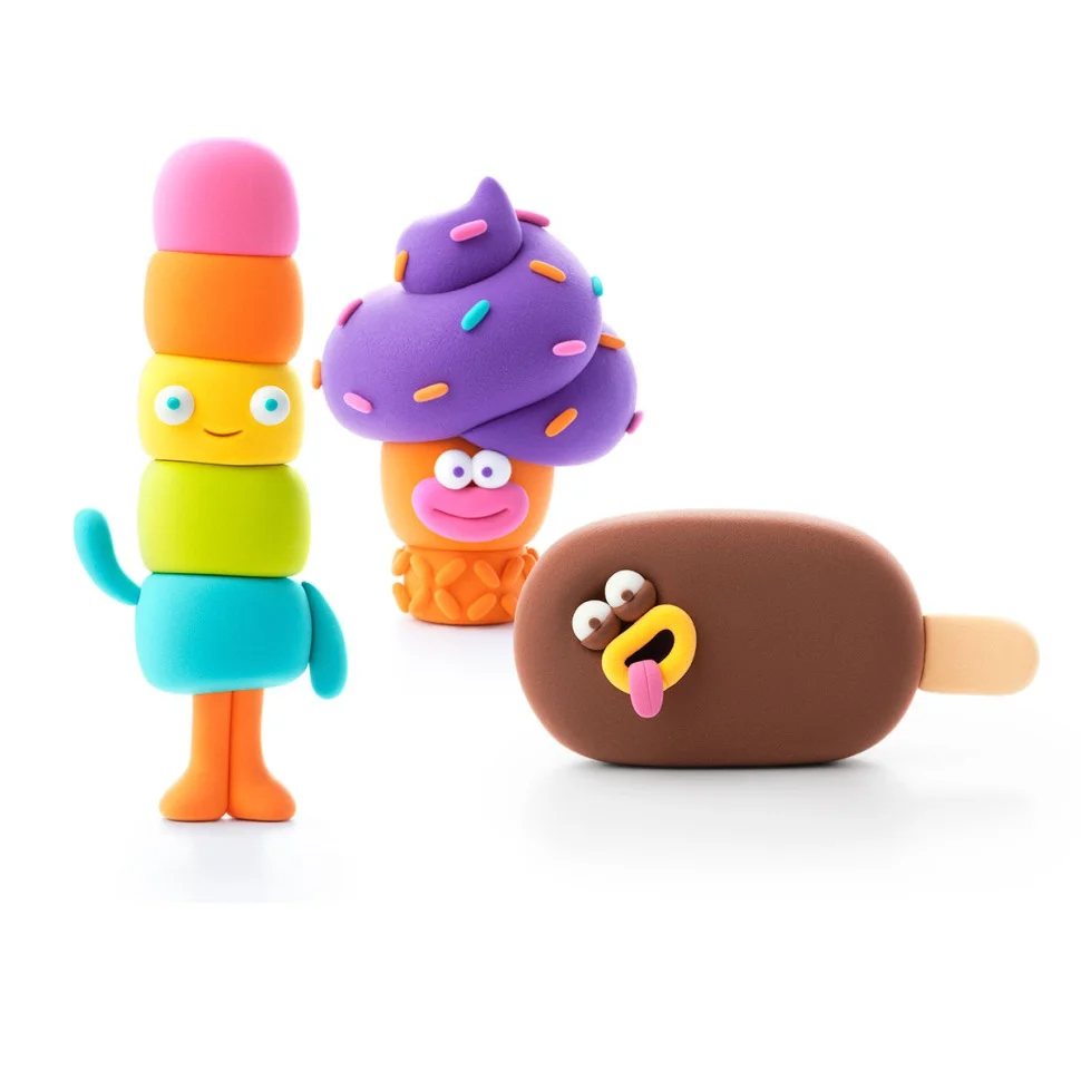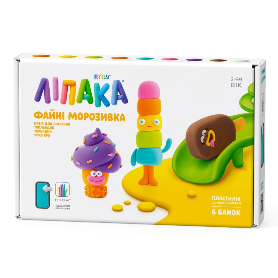 Набір самотвердіючого пластиліну ЛИПАКА – КЛАСНЕ МОРОЗИВО: ТЕПЛЕДИК, ТОРНАДИК, ЧОКО БРО – розважить і дітей, і дорослих. За допомогою анімаційних інструкцій у додатку HEY CLAY ви зможете зліпити 3 кумедних героїв. Пластилін твердне на повітрі за 24 години, після чого можна гратися створеними фігурками.