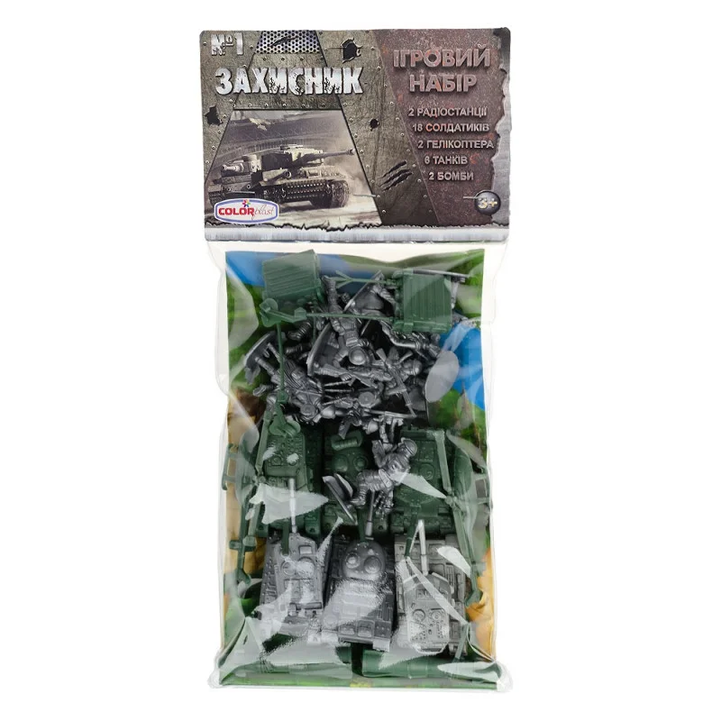 Солдатики "Захисник" №1. З таким ігровим набором відважних солдатів, потужної військової техніки та необхідного спорядження можна сміливо організувати цілу переможну військову кампанію! Танки різних модифікацій, радіостанції, снаряди і навіть вертольоти - все деталі набору виготовлені з максимальною точністю і увагою до найдрібніших деталей, фігурки солдатів в динамічних позах гранично точно передають емоції та дії в умовах справжнього бою.