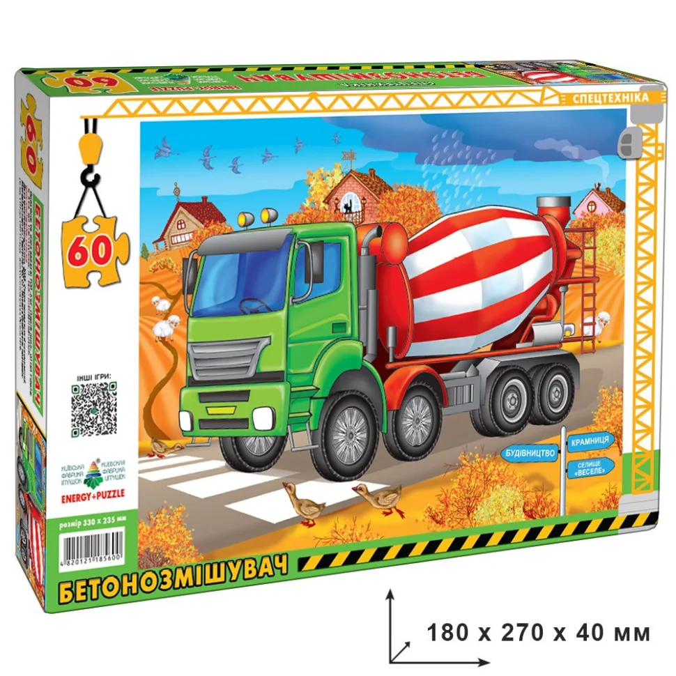 На ігровому полі розміром 235 х 330 мм зображено автомобіль БЕТОНОЗМІШУВАЧ. Поле розрізане кривими лініями на 60 частин, з яких потрібно зібрати цілу картинку.