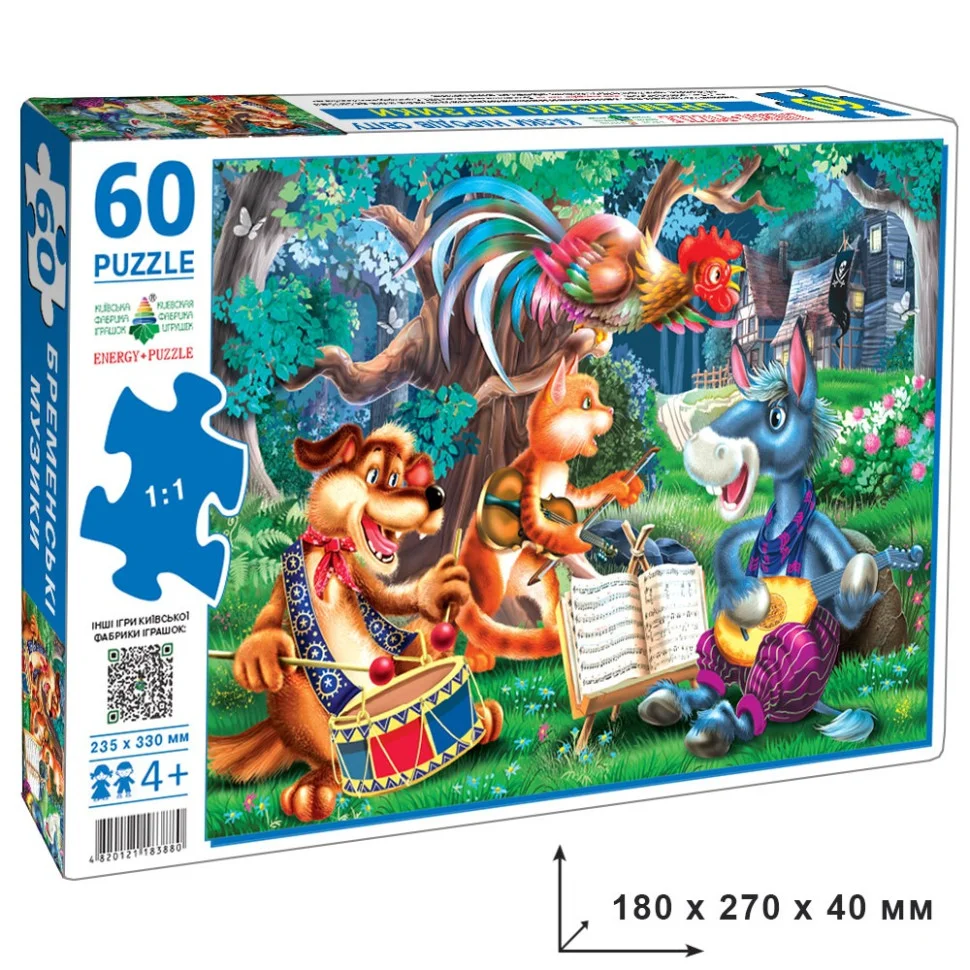 На ігровому полі розміром 235 х 330 мм зображено сюжет з казки БРЕМЕНСЬКІ МУЗИКИ. Поле розрізане кривими лініями на 60 частин, з яких потрібно зібрати цілу картинку.