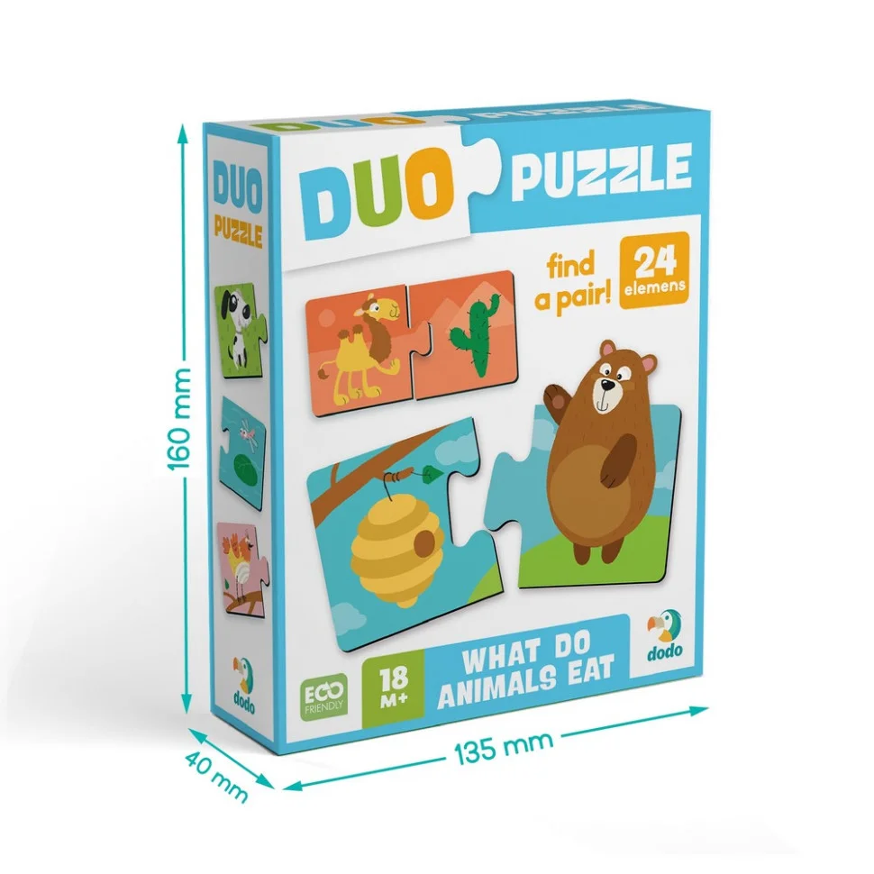 Пазл Dodo DUO “Хто що їсть?” — це ідеальний перший пазл для малюків: корисний, яскравий і продуманий до дрібниць. Він стане чудовим подарунком для дітей від 1,5 років і допоможе перетворити навчання на цікаву гру щодня