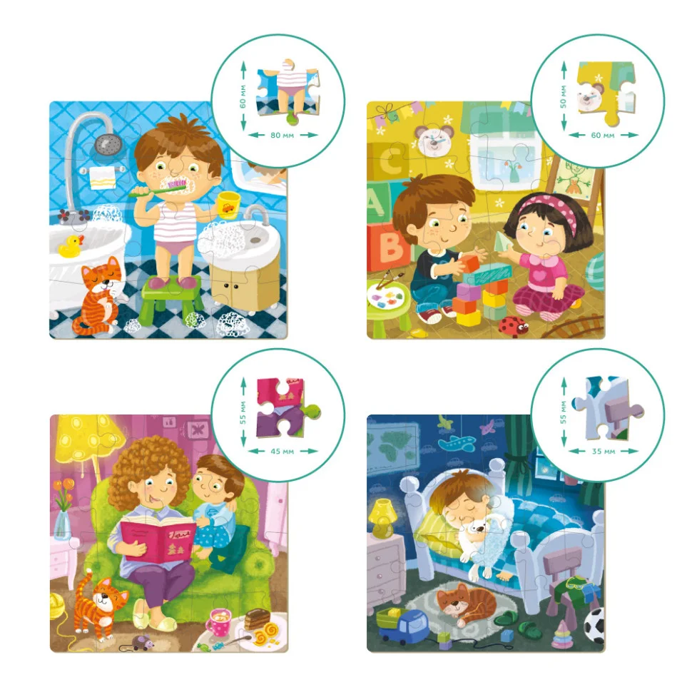 Збираючи пазли 4 в 1 Мій день, малюк в ігровій формі вивчить поділ доби на ранок, день, вечір і ніч.