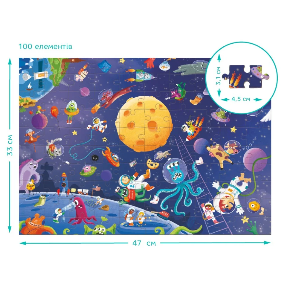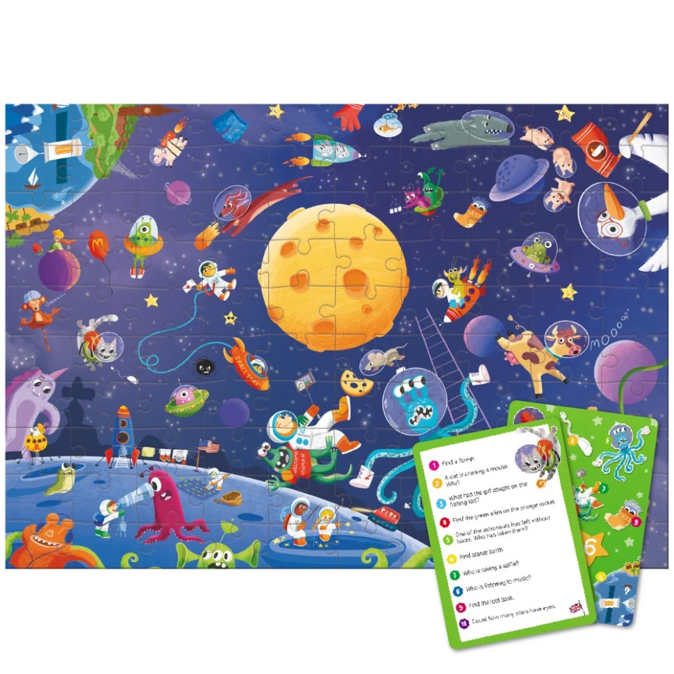 Шукаєте цікавий та розвиваючий пазл для дітей? Подаруйте малюку справжню новорічну пригоду з пазлом "Look & Find Шалений космос" від бренду Dodo! Цей розвиваючий пазл на 100 елементів поєднує складання з веселою грою на уважність: після завершення картинки дитина має знайти заховані об’єкти за підказками на спеціальних картках.