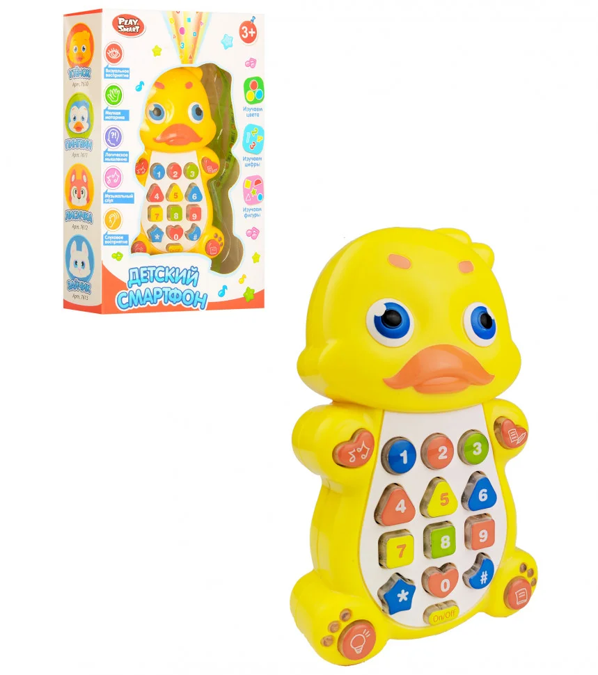 Телефон навчальний 7614, що володіє безліччю корисних функцій, відрізняється барвистим, привабливим дизайном. Кумедна розвиваюча іграшка представлена у вигляді милого звірятка, з яким Ваш малюк не побажає розлучатися ні на секунду. Міцний корпус, розроблений із зносостійкого, гіпоалергенного пластика, практично не має запаху і є абсолютно нешкідливим для дитячого здоров'я. Дитячий смартфон-звірятко розміром 14 см, з музичними ефектами українською мовою доповнений проектором. За допомогою іграшки Ваша дитина буде прослуховувати казки, вивчати цифри, віршики, нові кольори. Граючи і натискаючи на кнопки, дитина зможе самостійно активувати відтворення мелодій, розвиваючи дрібну моторику пальчиків і уяву. Завдяки вбудованому проектору Ваш малюк зможе направляти верхню частину телефону на чисту, білу поверхню, щоб подивитися зображення геометричних фігур і цифр.
