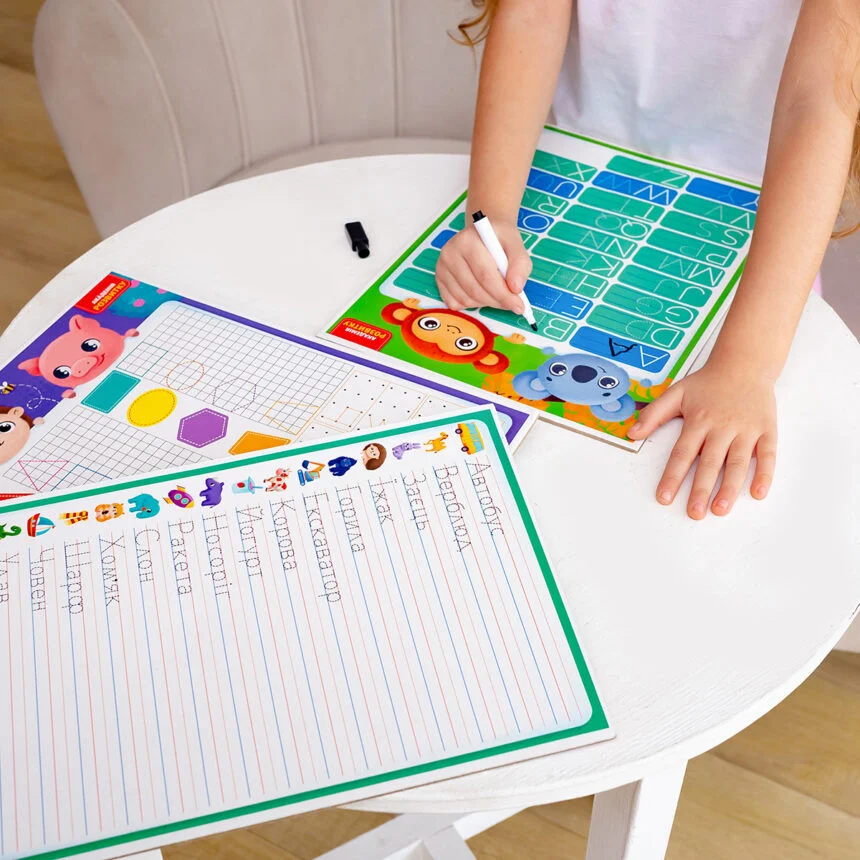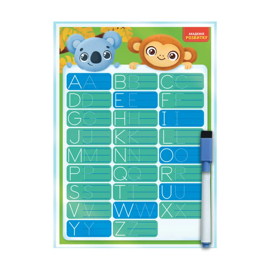 Набір містить двосторонню дошку та багаторазовий маркер. З однієї сторони зображено українську абетку, а з іншої – слова на кожну букву. Дитина може спочатку обвести букви та слова по контурах, а потім написати їх в рядок самостійно.