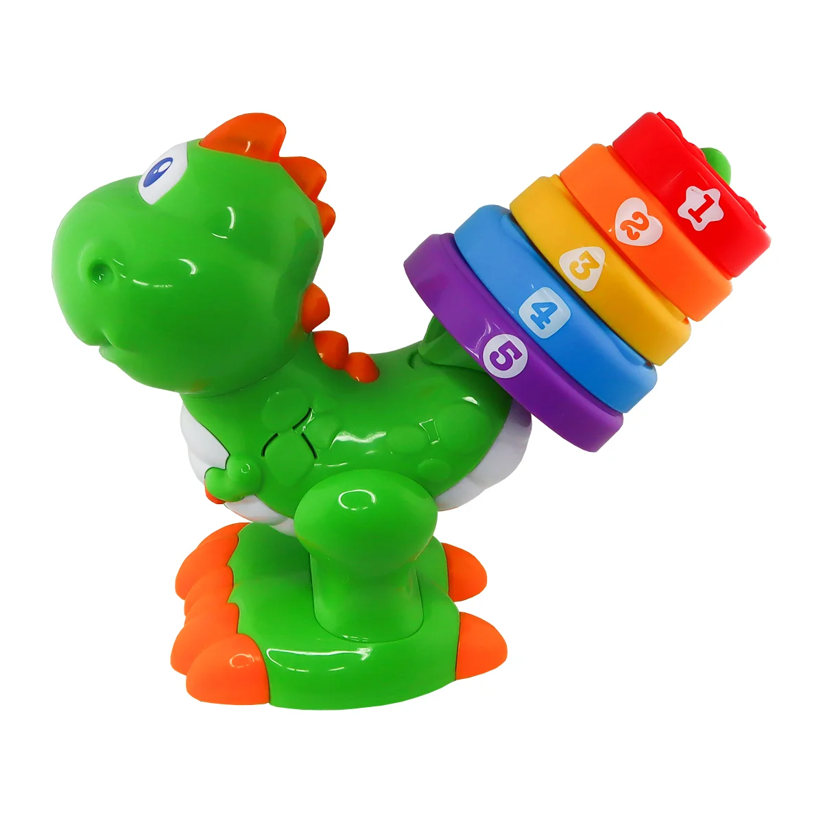 - Опускайте кільця на хвостик, щоб динозаврик промовляв числа або кольори.