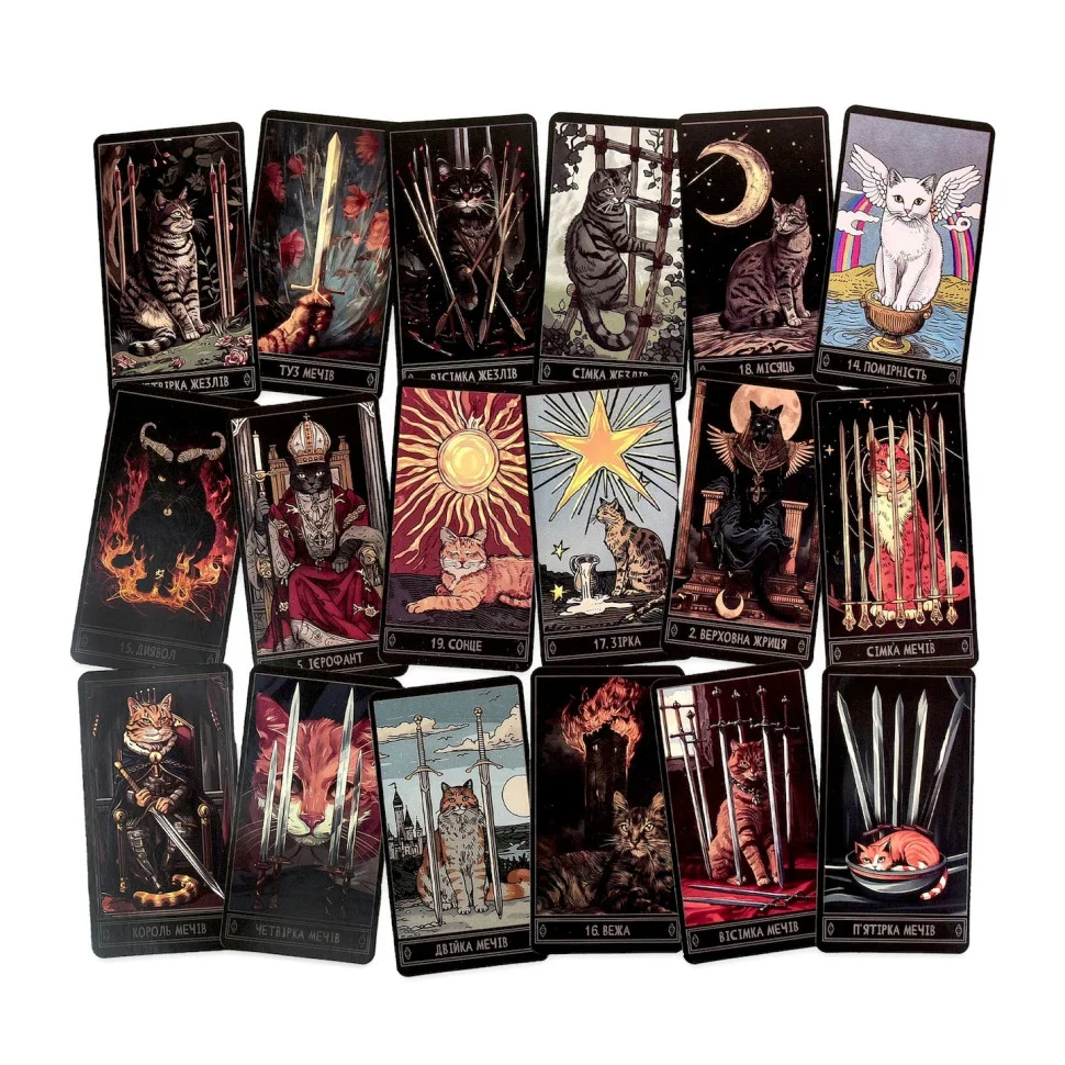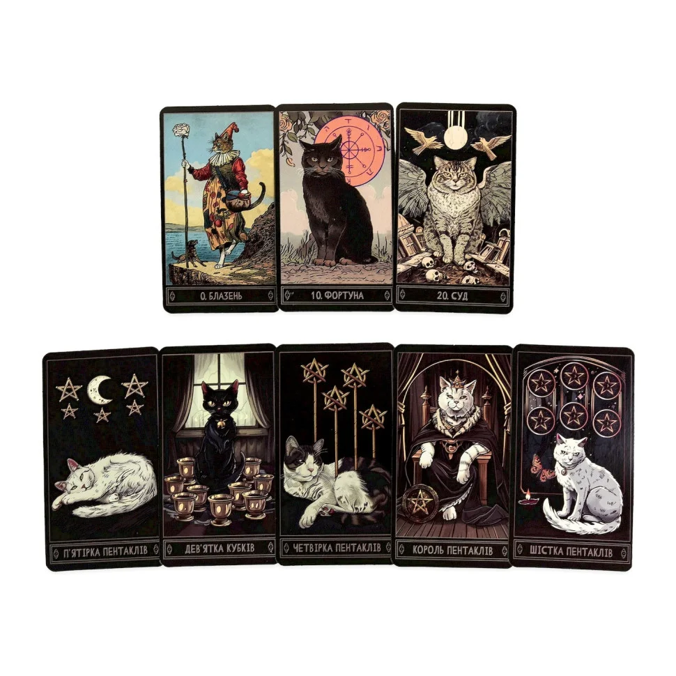 Карти «Таро» — це набір карт для тих, хто хоче краще відчути себе, прислухатися до інтуїції та заглянути глибше у щоденні питання. У цій колоді – образи котів, які поєднують мудрість, спокій і трохи магії. Кожна карта має власне послання, що допоможе побачити ситуацію під іншим кутом або знайти новий життєвий напрямок.