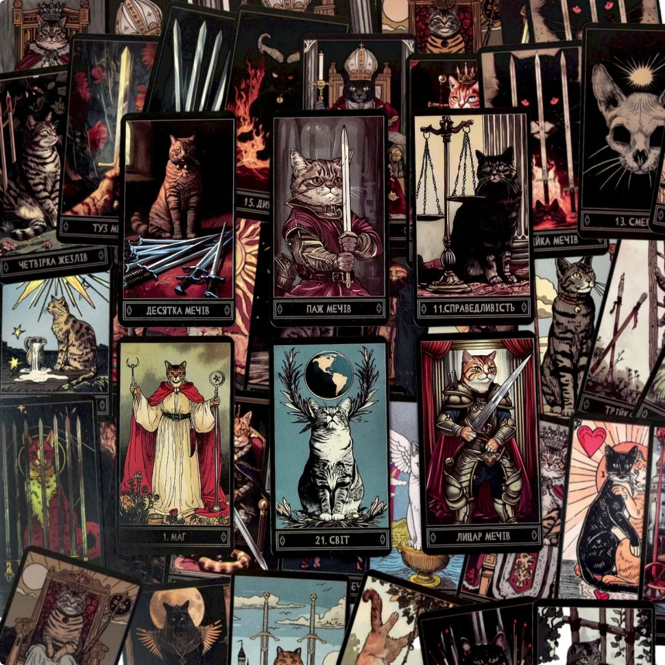 Ці котики не пророкують, а натякають. Вони спостерігають із тіні, запрошуючи довіритися власному відчуттю та подивитися на себе по-іншому – чесно, глибоко, без зовнішнього шуму.