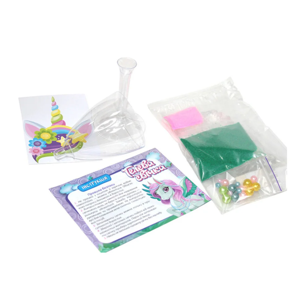 Набір містить: стаканчик, свічковий гель, гніт, кольоровий пісок, скотч, намистинки, картонну прикрасу, покрокову інструкцію.