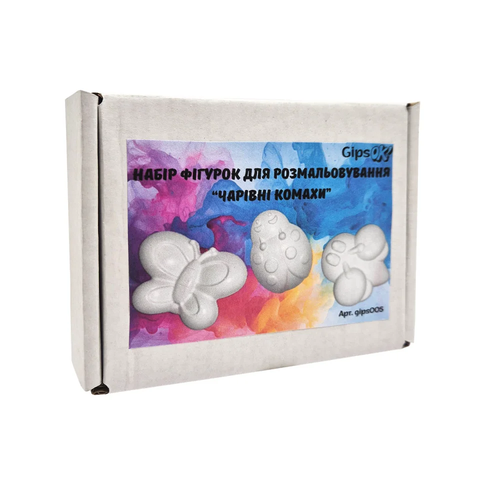 Творчий набір «Чарівні комахи» - це чудова можливість для дітей і дорослих проявити фантазію та створити власні яскраві шедеври. У наборі - три фігурки з гіпсу у вигляді милих комах, які легко розмальовуються фарбами, фломастерами або олівцями.