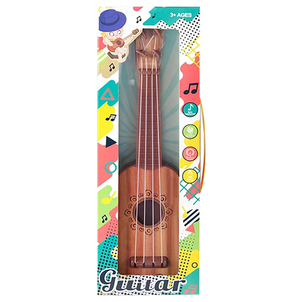 Ця мініатюрна дитяча іграшкова гітара виконана у формі укулеле з традиційним кольоровим дизайном та візерунками. Іграшка має 4 нейлонові струни та металеві поріжки, щоб малюкові було легше затискати та грати свої перші забавні акорди, а також дерев'яні колочки, щоб налаштовувати гітару.