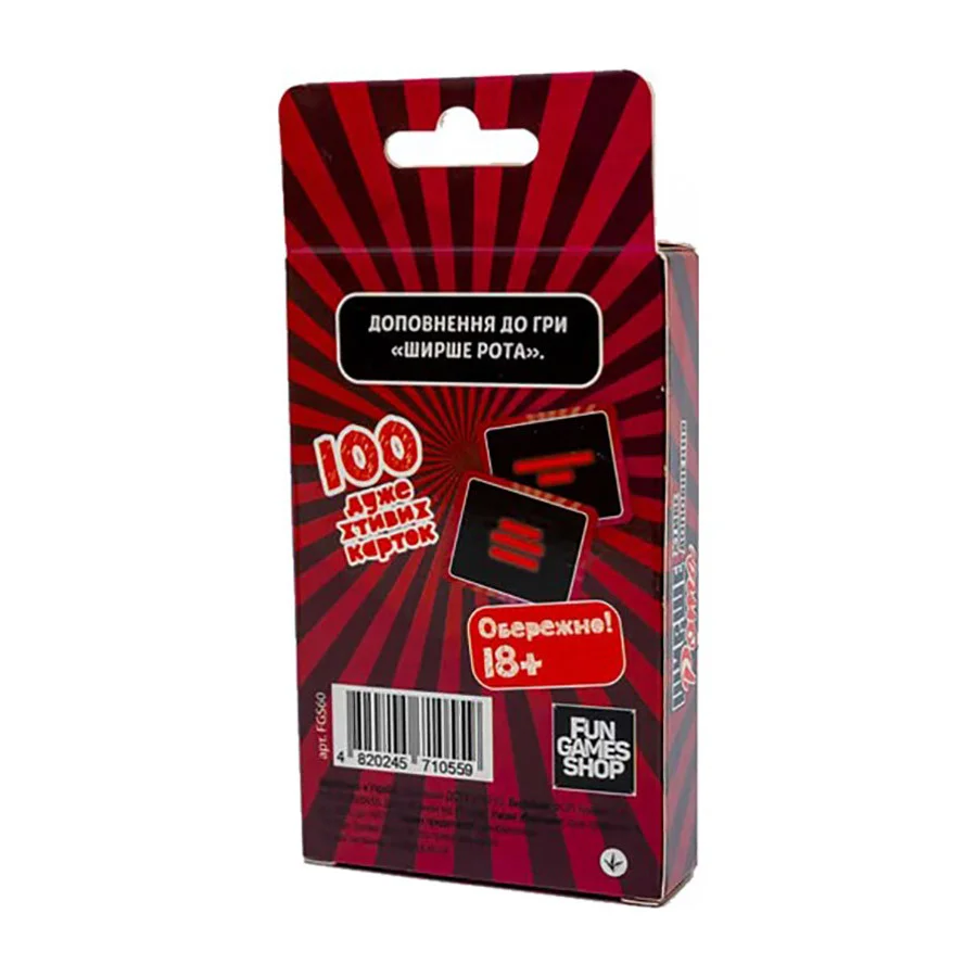 Вгадаєте, що робить майже кожну веселу настільну гру іще веселішою? Так, саме так — це доповнення, що має рейтинг 18+! Тепер вам доведеться не лише несамовито реготати, а й ніяково червоніти час від часу… Повірте, такого ви в своєму житті точно ще не промовляли!
