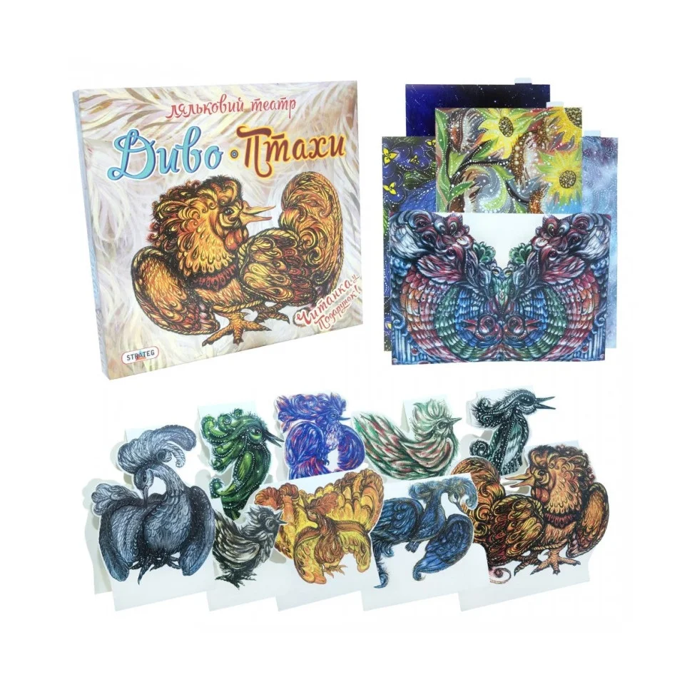 Цікаві історії з хоробрими, добрими і розумними героями, в яких присутня мораль і обов'язково хороший кінець – це настільний міні-театр "Ляльковий театр Чудо-Птиці" Strateg (321). Об'ємні фігурки яскравих, фантастичних птахів, змінні фонові картинки перетворюють звичайне читання книжки в незвичайне, яке точно запам'ятається. У наборі є збірник текстів з історіями і казками, головні герої яких – представники пернатого світу, а також їх кольорові фігурки Всі вони закріплені на підставках і можуть стояти вертикально.