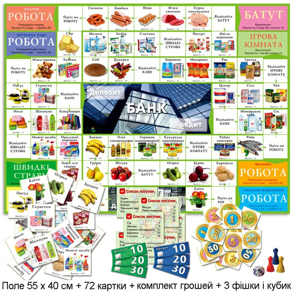 Комплектація: поле для гри (55*40см), картки-завдання - 8шт., картки-товари - 48шт., картки-гроші - 63шт., картки “Депозит”, “Кредит” - 16шт., коплект спеціальних грошей, фішки - 3шт., кубик, правила гри (укр та рос.)