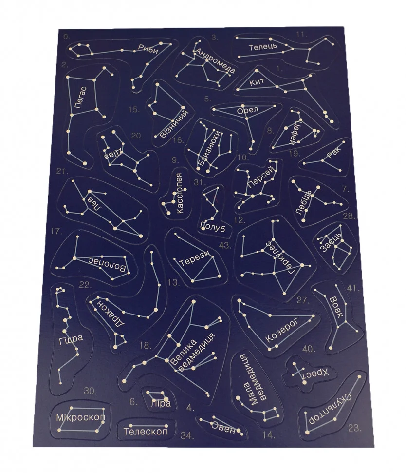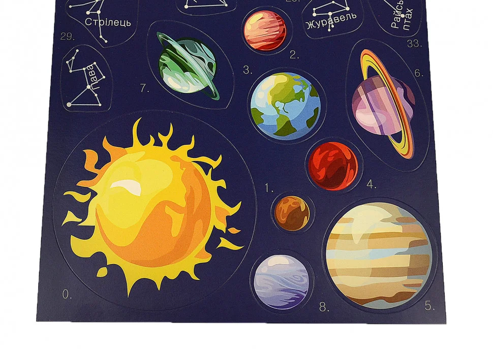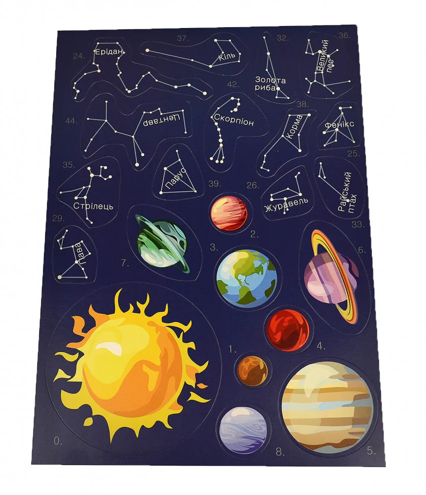 Зоряне небо - ваш незамінний помічник для подорожей в космос! Великий постер у вигляді карти зоряного неба зачарує малюка. Вас чекають 45 сузір'їв, планети сонячної системи і небесні тіла.