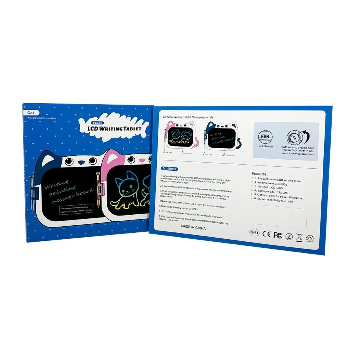 Графічний планшет Kids Pad 9" Color Kat — це РК-дошка для письма, яка дозволяє дітям віком від 3 років вільно використовувати свою уяву для малювання! Розкрийте свою природну інтуїцію, полюбіть малювати, рахувати та писати слова в будь-який час і в будь-якому місці. Ви можете писати все, що завгодно, за допомогою ручки, що йде в комплекті. Дошка для малювання має функцію стирання одним натисканням кнопки, яка миттєво очищає все на дошці. Також є функція блокування, яка гарантує, що дитина не зітре малюнок під час малювання. РК-дошка для малювання виготовлена з безпечного, нетоксичного і міцного матеріалу, що забезпечує здоров'я і безпеку ваших дітей. Вона стійка до падінь і бризок для безтурботного використання дітьми. 9-дюймову дитячу дошку для малювання легко носити з собою куди завгодно: школа, літак, автомобіль, дорожні поїздки, на вулиці тощо. Екран не має шкідливого випромінювання та мерехтіння. Він абсолютно безпечний для зору, тому не має потреби обмежувати дитину в прояві творчості.