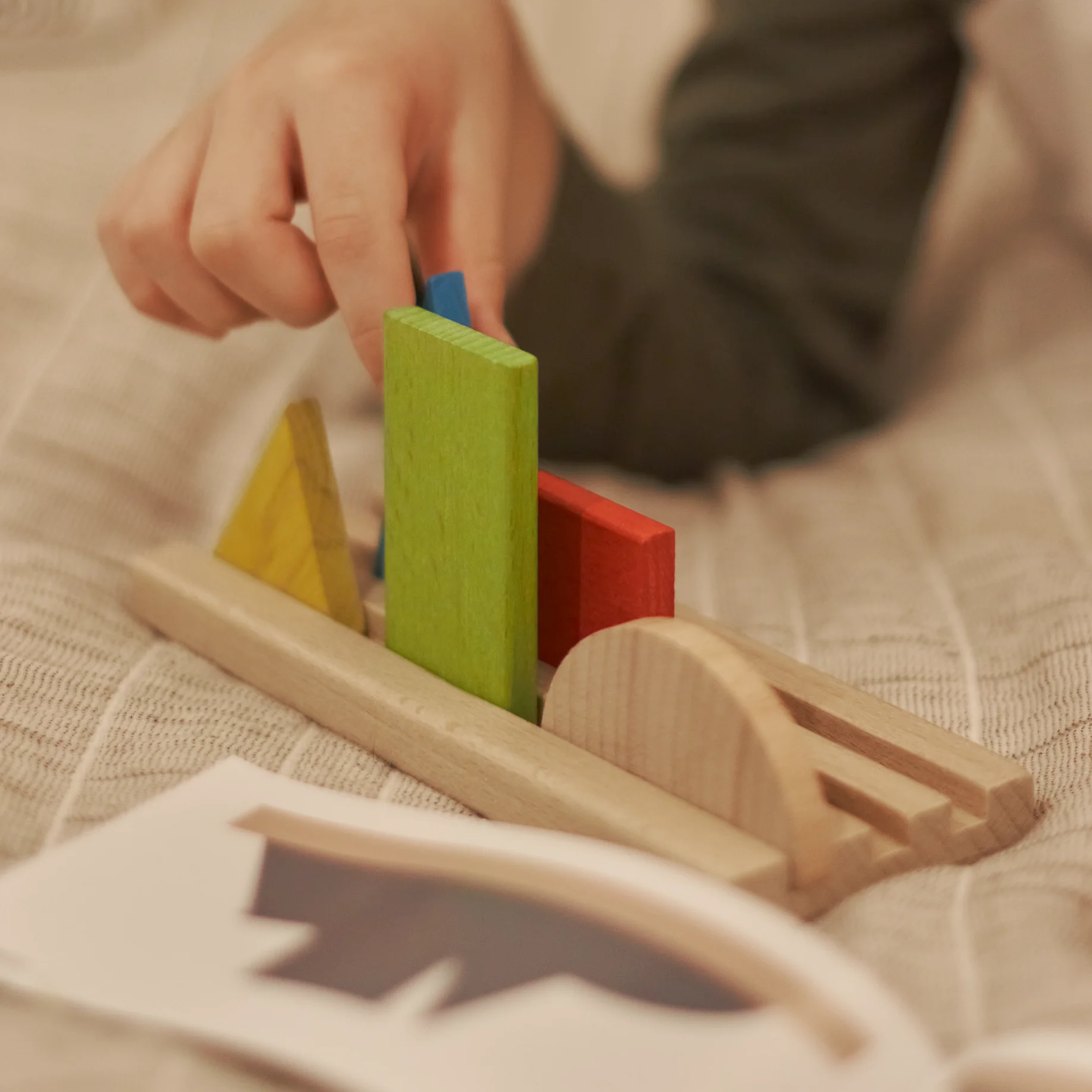 До набору входить 5 різнокольорових геометричних фігур і дошка-основа з трьома повздовжніми пазами. Задача дитини – поставити фігури в пази основи таким чином, щоб зображення відповідало завданню в книжечці-інструкції.