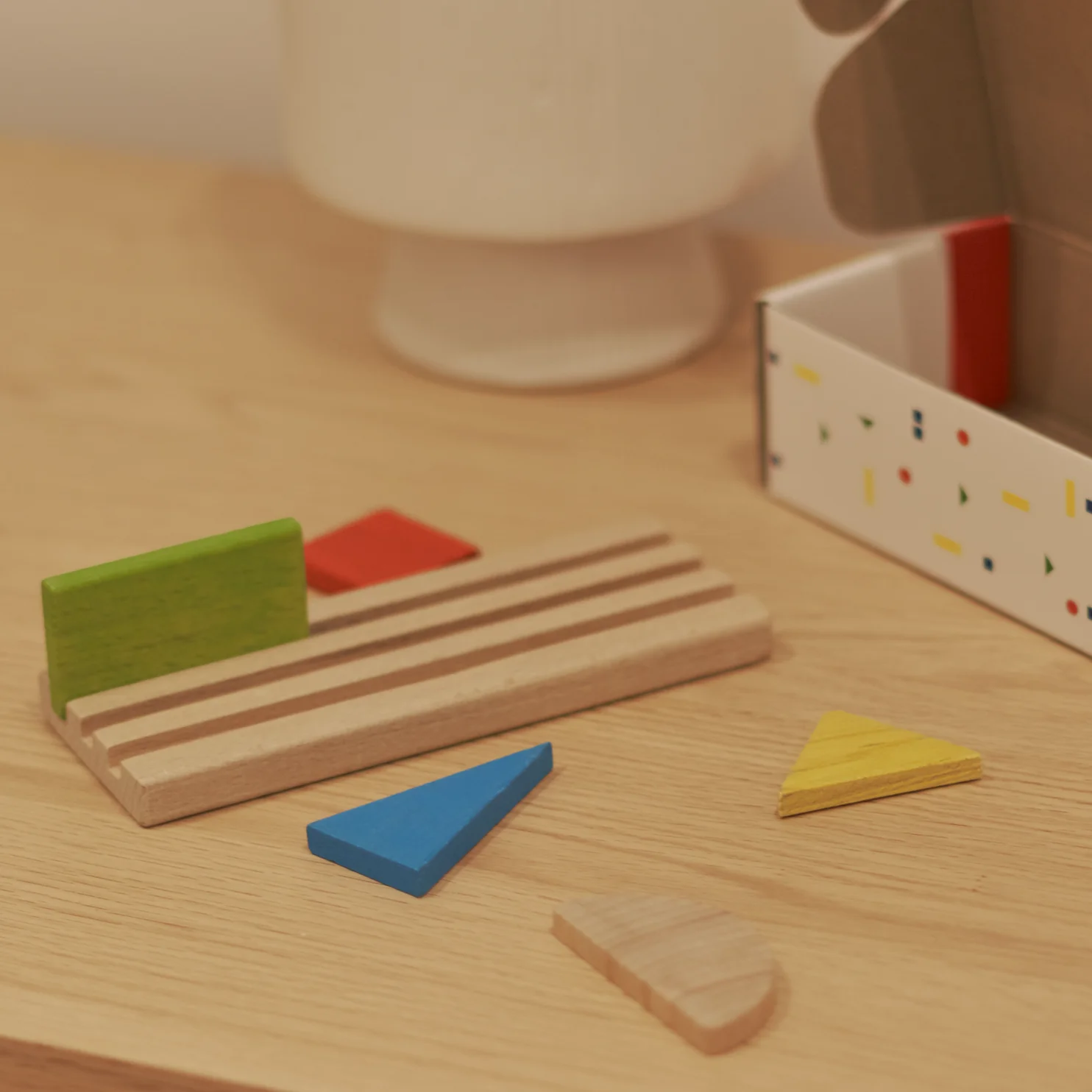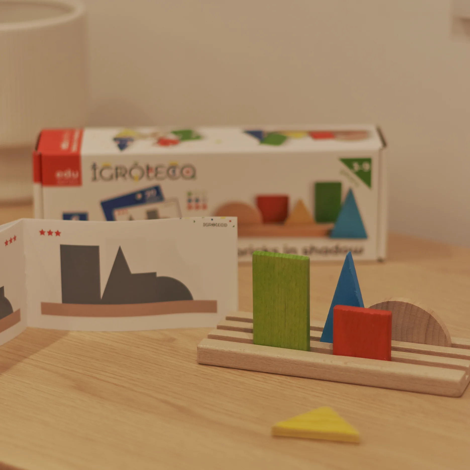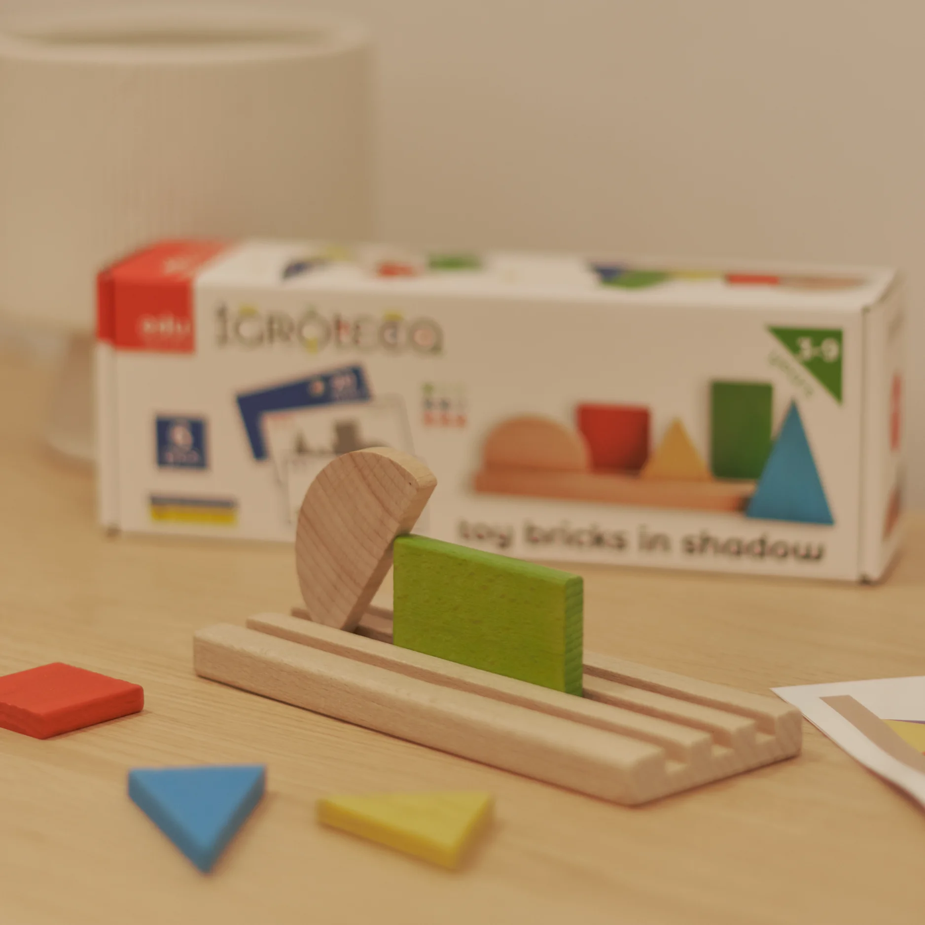 У який з пазів основи поставити синій трикутник, щоб він наполовину сховався за червоним квадратом і не закривав собою півколо, яке ховається за жовтим трикутником? Цікаво? Ця гра захопить уваги не лише дітей, а й дорослих!