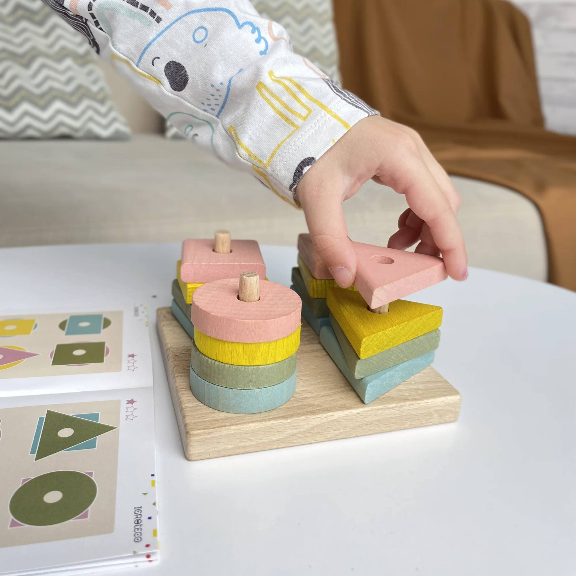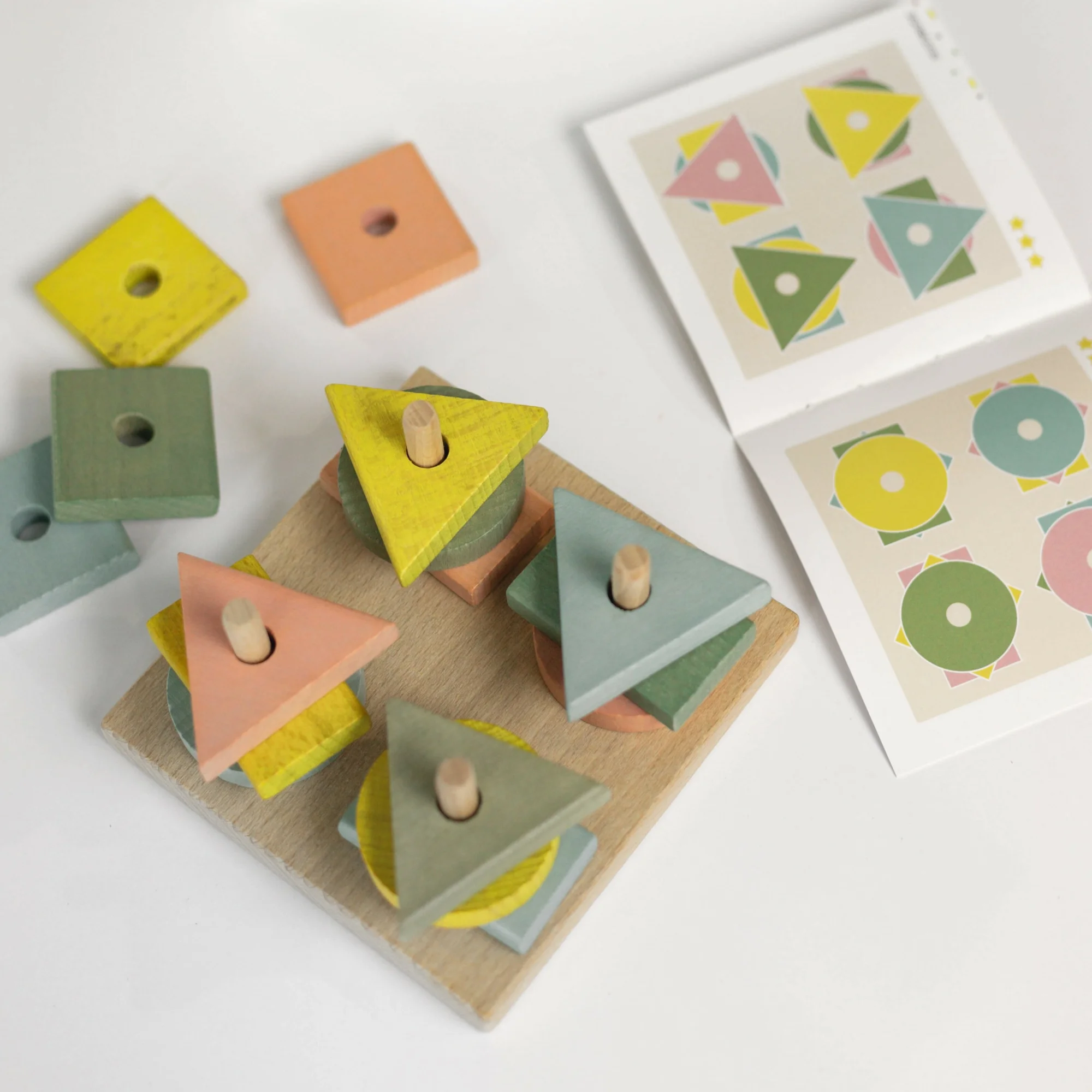 У наборі: дерев’яна дощечка з 4 штирями (125х65 мм), геометричні фігури: квадрати, прямокутники, трикутники, круги (4 пастельних кольорів), книжечка із завданнями.