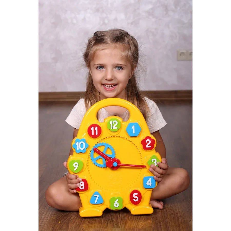 Годинник допоможуть малюкові навчитися визначати час. На циферблаті розташовані геометричні фігурки з цифрами, які виймаються.
