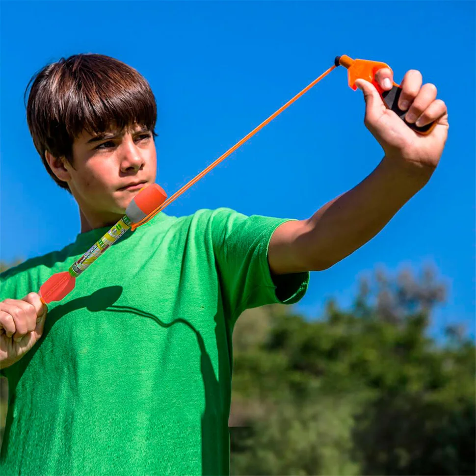 В комплекті спеціально розроблений запускач. Просто зачепіть ракету, відтягніть назад та відпускайте! Все дуже легко!