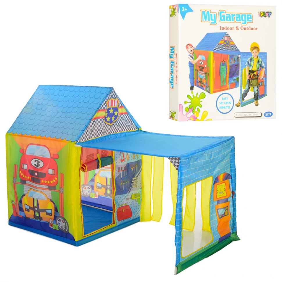 Багатофункціональний дитячий намет M 5685 Гараж відрізняється барвистим, привабливим виконанням з веселими малюнками, що викличе море позитивних емоцій і у хлопчика, і у дівчинки. Яскрава, компактна модель не займе багато місця в багажі, тому його зручно брати з собою в подорожі або вирушаючи на природу за межі міста. Намет буде чудово виглядати в будь-якому дитячому куточку, стане улюбленим місцем для ігор, де Ваш непосида із задоволенням облаштує власне, затишне гніздечко. Конструкція являє собою класичний будиночок з дахом, доповнений навісом, який значно розширює простір, що особливо зручно під час активного відпочинку на відкритому повітрі в сонячну, жарку погоду. Будиночок оснащений відкидними дверцятами, які збираються в рулончик, і фіксуються на верхній частині прорізу. За рахунок спеціального, швидко розкладаючогося механізму намет буде готовий за лічені секунди, а при необхідності його можна зібрати одним рухом.