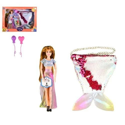 Ігровий набір "Emily" з лялькою і дитячої сумочкою. У ляльки рухливі руки і ноги (з шарнірами). Сумочка ф формі хвоста русалки. Прикрашена блискучими паєтками. Висота ляльки - 30 см., Розмір сумочки - 26х20 см. Виконаний набір з якісних і безпечних матеріалів. Для дітей від 3-х років.