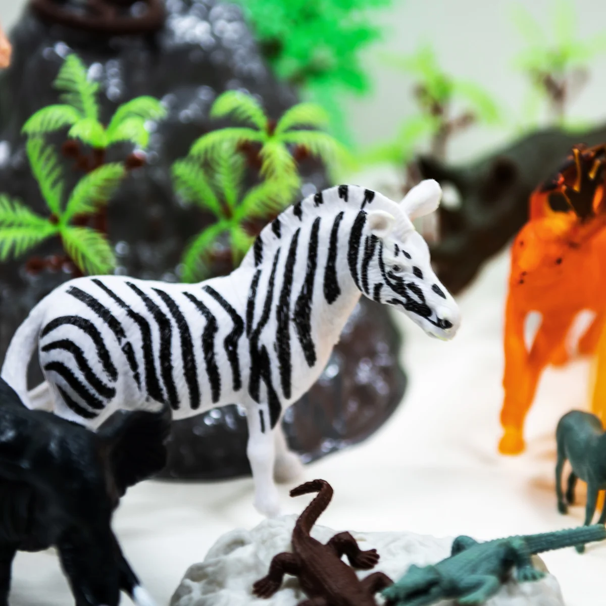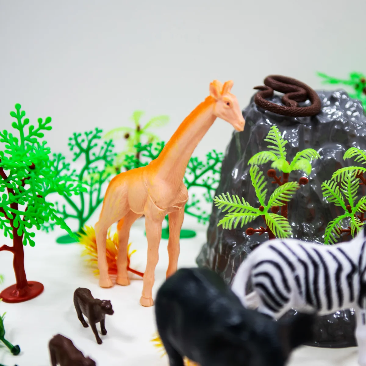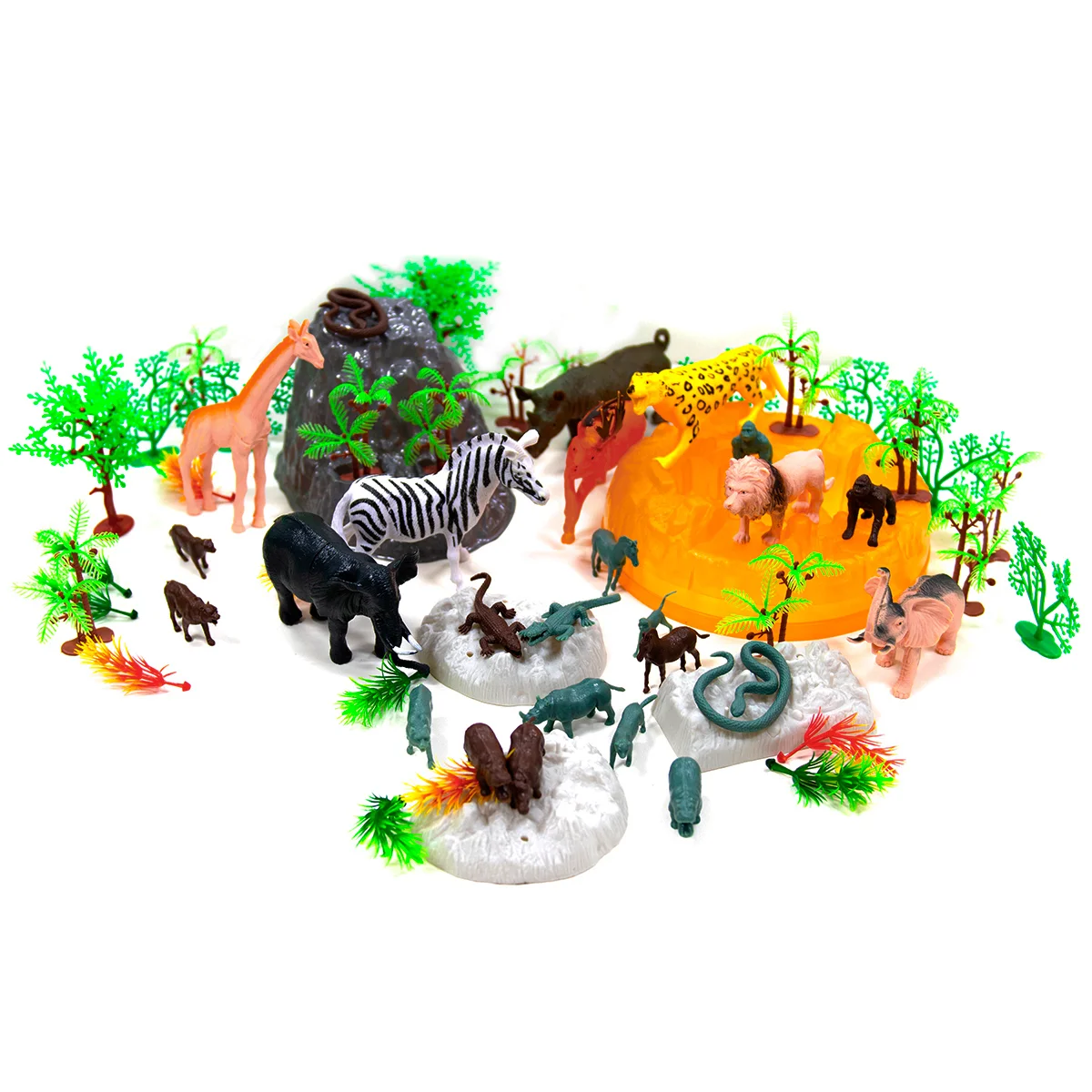 - 57 предметів! Різноманітні дикі тварини: жирафа, зебра, слон, лев, бегемот, тигр та багато інших! А ще різноманітні дерева та скелі для створення навколишньої природи.