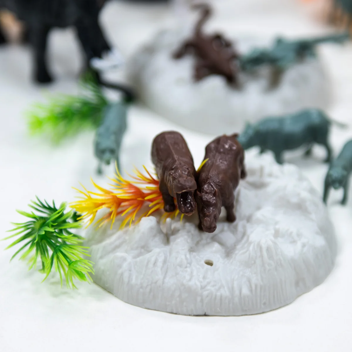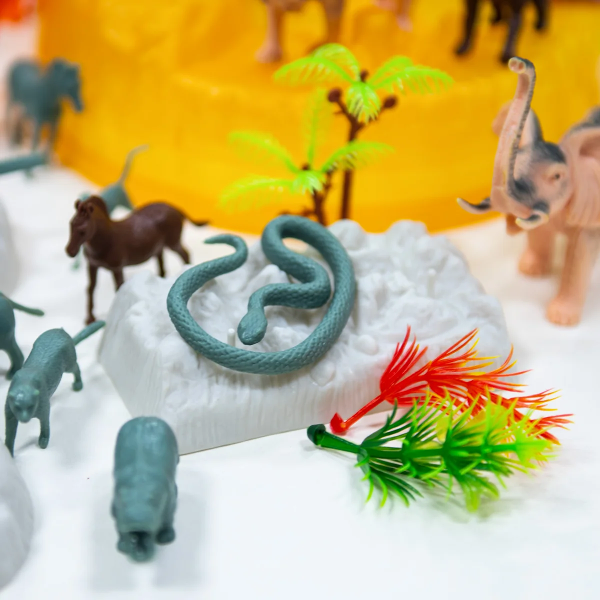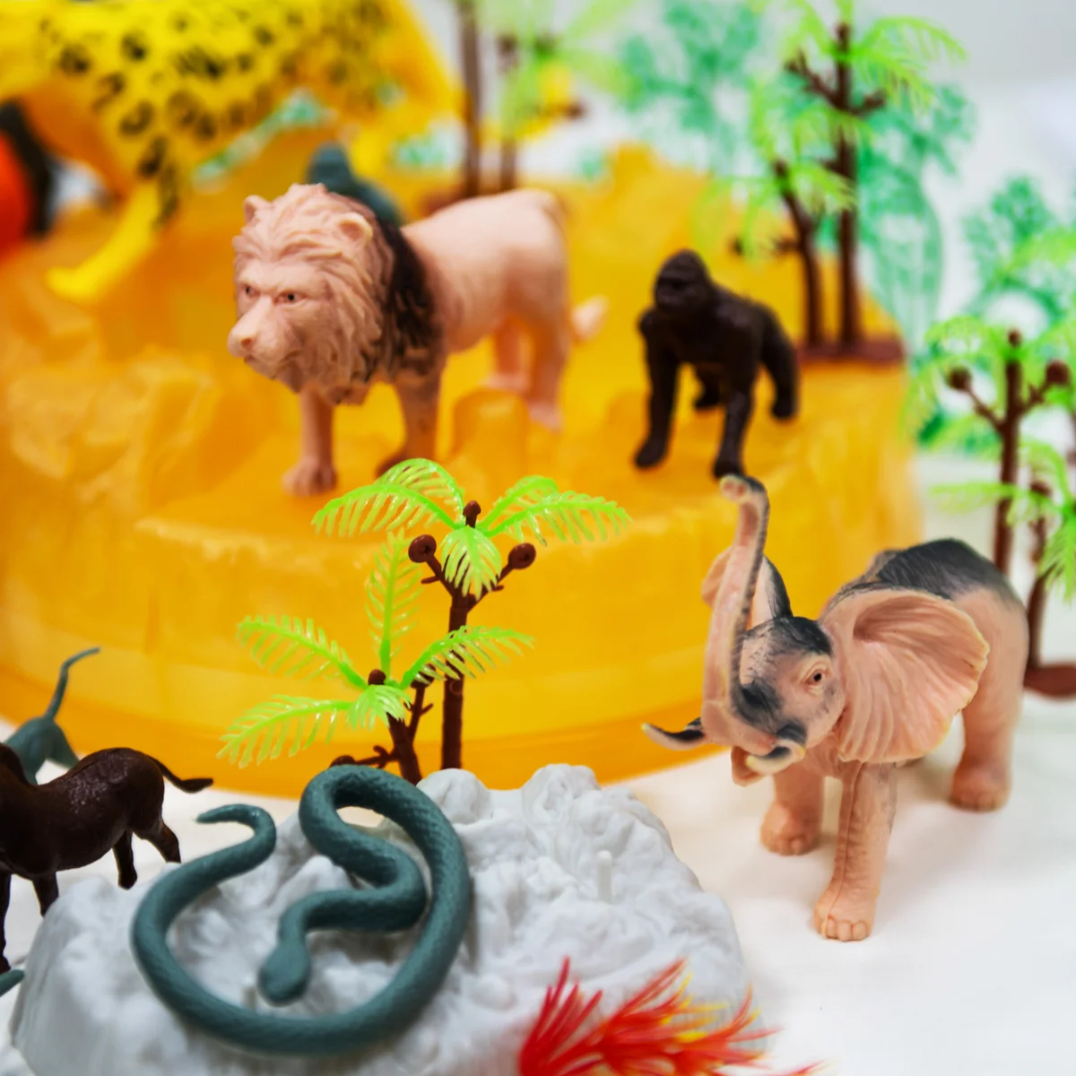 - 57 предметів! Різноманітні дикі тварини: жирафа, зебра, слон, лев, бегемот, тигр та багато інших! А ще різноманітні дерева та скелі для створення навколишньої природи.