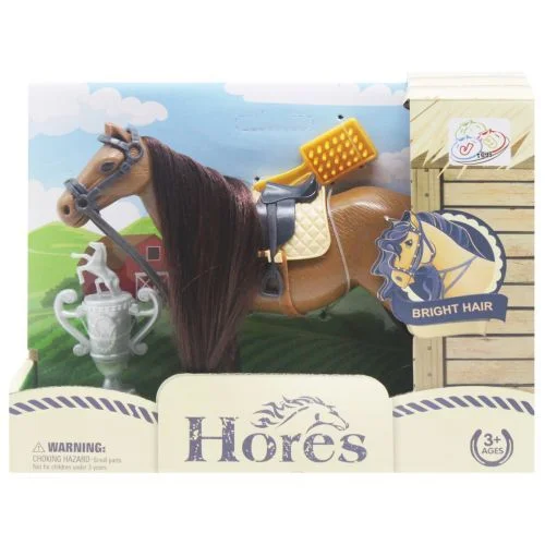 Пластикова фігурка конячки з пишною, блискучою гривою. У наборі є гребінець та трофей. Спорядження для їзди виповнено з гуми, можна зняти. Розмір конячки: 14х13 см. Для дітей віком від 3-х років.