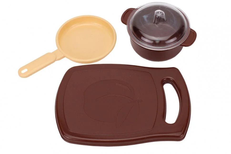 Комплектація: панель з електронним модулем, дощечка, каструля з кришкою, сковорідка, ложка - 2 шт., виделка - 2 шт., ніж - 2 шт., тарілка - 2 шт., виделка велика, шумівка, лопатка, черпак, огірок , морква, баклажан, помідор, коробочка - 2 шт.